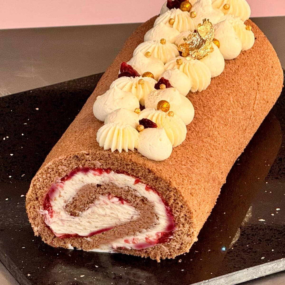 Bizcocho genovés a base de fecula de maíz, cacao, mantequilla y vainilla natural relleno de jam de frambuesa y ganache de chocolate blanco.