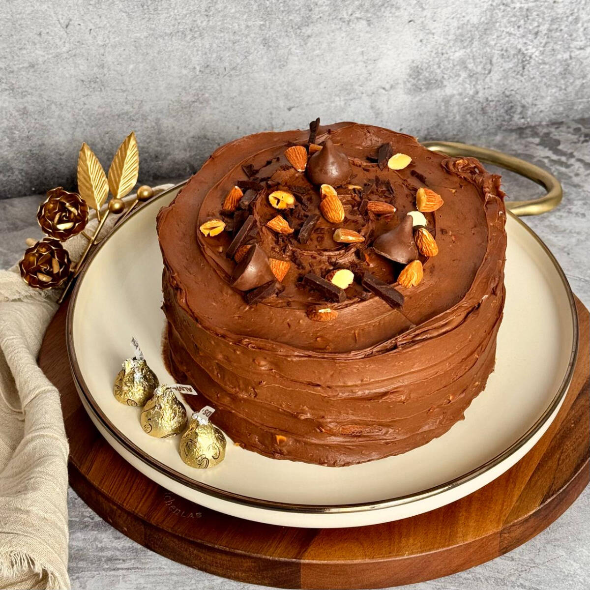 Bizcocho suave y húmedo amarillo de mantequilla, jocoque y vainilla natural cubierto con ganache de chocolate semiamargo Valrhona con almendras tostadas, decorado con Kisses y almendras.