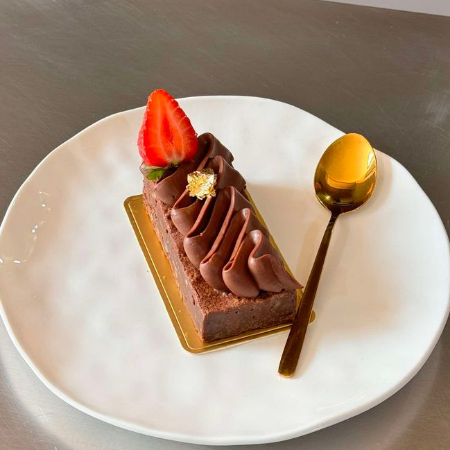 Bizcocho suave y húmedo a base de chocolate, mantequilla y cafe, relleno de toffee de caramelo con leche y cubierto de ganache de chocolate semiamargo Valrhona.