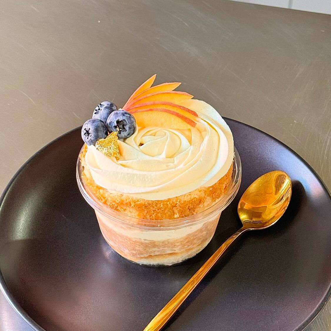 Base sablee especiada reconstituida, con cremosa mezcla de queso crema, nata de leche, vainilla natural, compota de blueberries y mousse de chocolate blanco Valrhona.