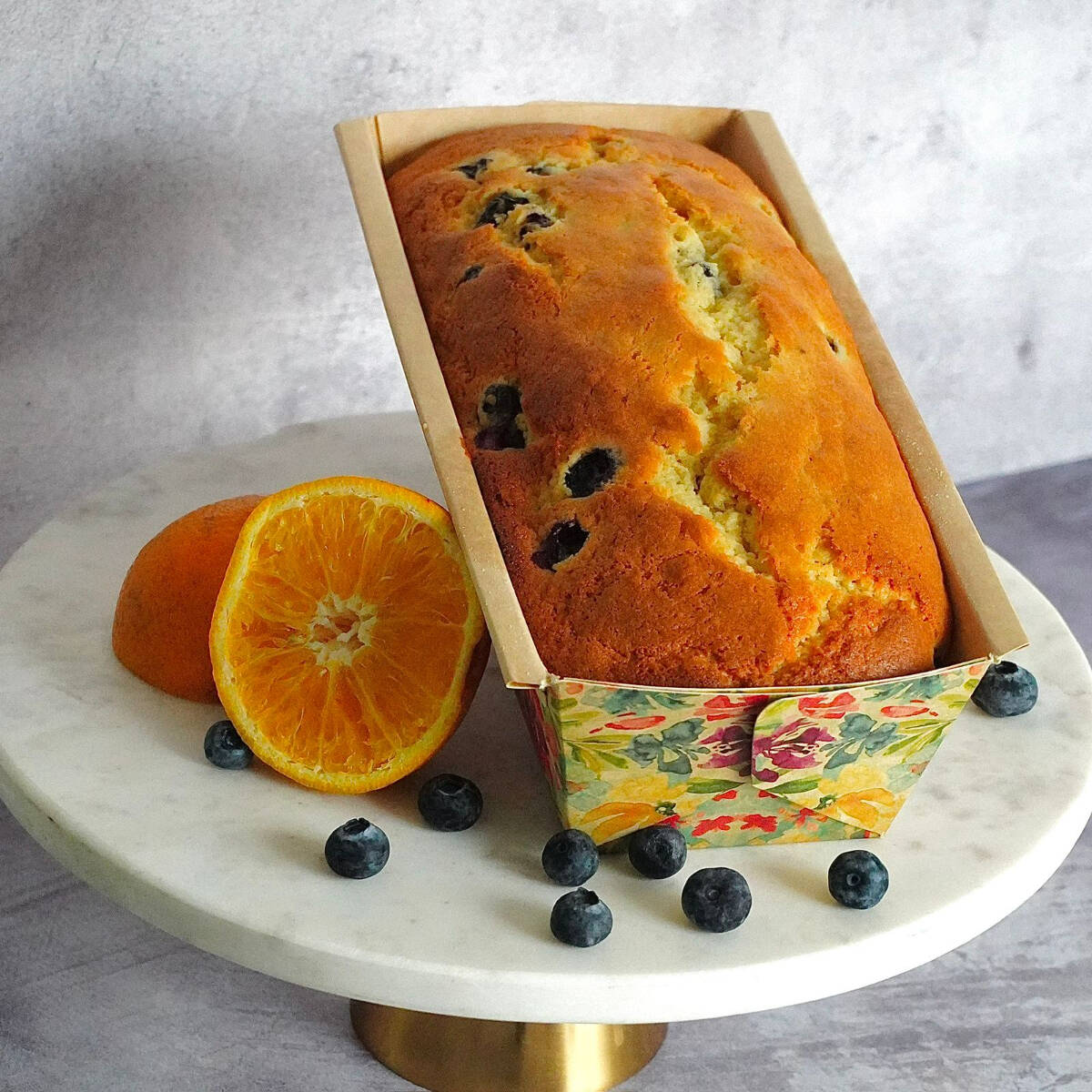Suave, húmedo y esponjoso panqué de naranja a base de harina de almendras, mantequilla y naranja natural con blueberries incrustados. 6-7 Porciones