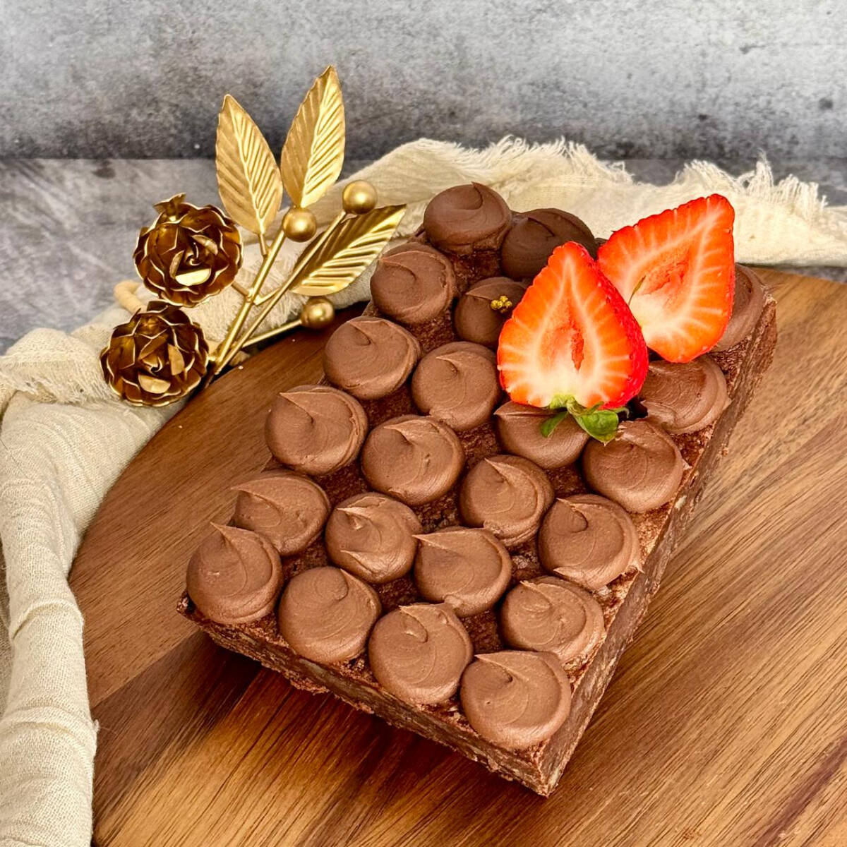 Bizcocho suave y delicado a base de mantequilla, cacao y nata de leche, relleno de ganache de chocolate semiamargo y betún de queso crema, decorado con frutos rojos y hoja de oro comestible.