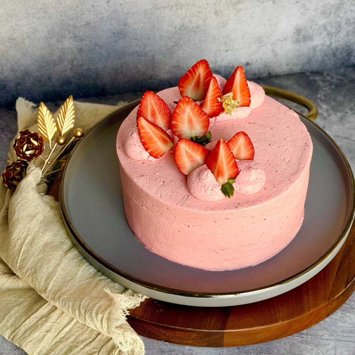 Bizcocho suave y húmedo a base de fresa natural y mantequilla, relleno de compota de fresa, betún de queso crema y fresas liofilizadas, decorado con fresas frescas.