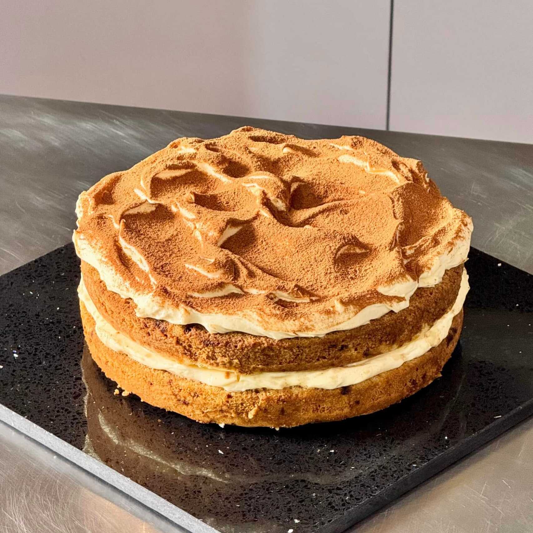 Bizcocho suave y húmedo a base de mantequilla, crema ácida y café humedecido con café, relleno y cubierto de mousse de queso mascarpone y cacao en polvo. 10 Porciones.