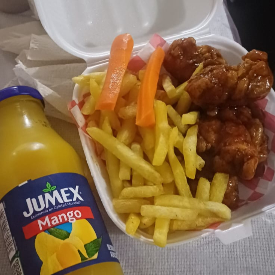 Combo irresistible: boneless crujientes bañados en la salsa de tu elección, acompañados de papas fritas doraditas y un refrescante jugo de mango bien frío. La combinación perfecta entre lo picosito, lo crujiente y lo dulce. ¡Ideal para darte un gustito o compartir!