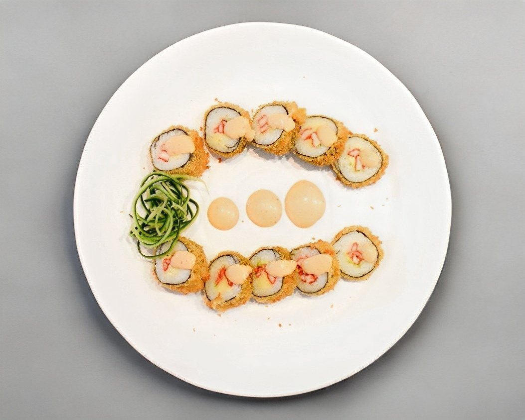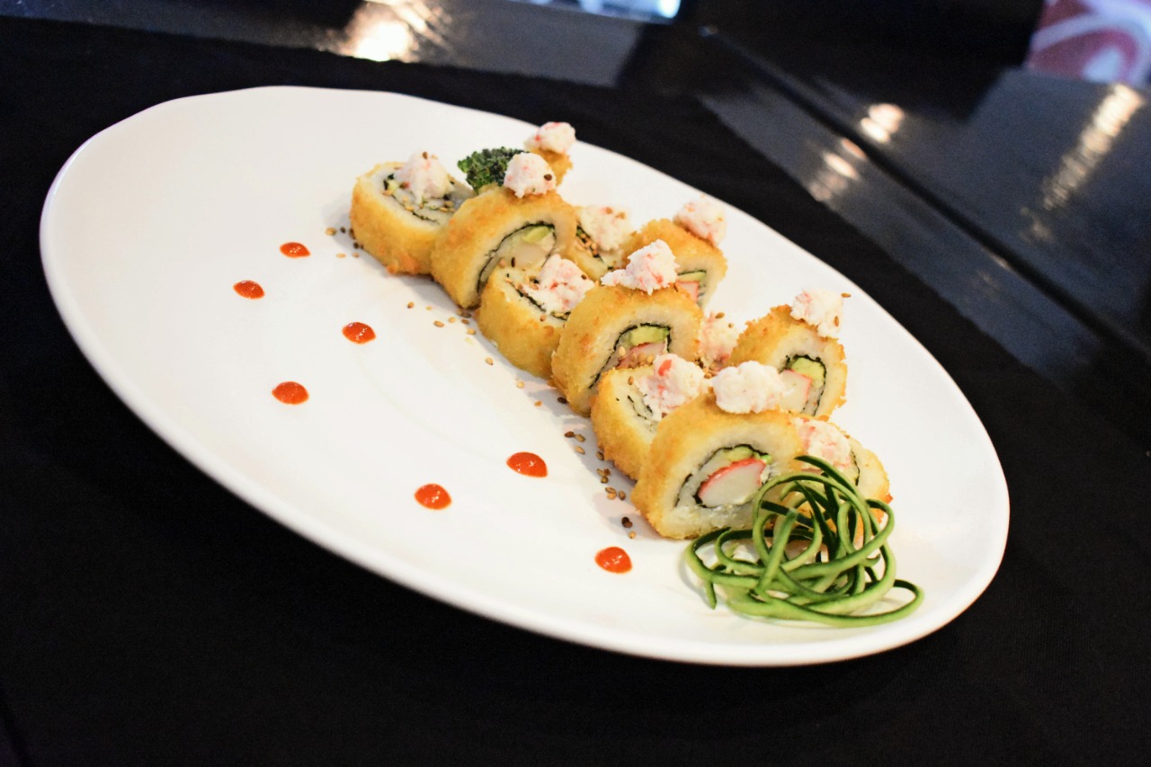 Cangrejo aguacate, queso crema, alga por fuera, capeado y chipotle.