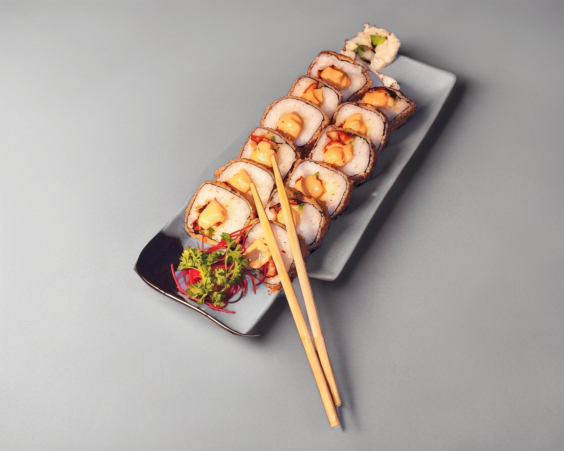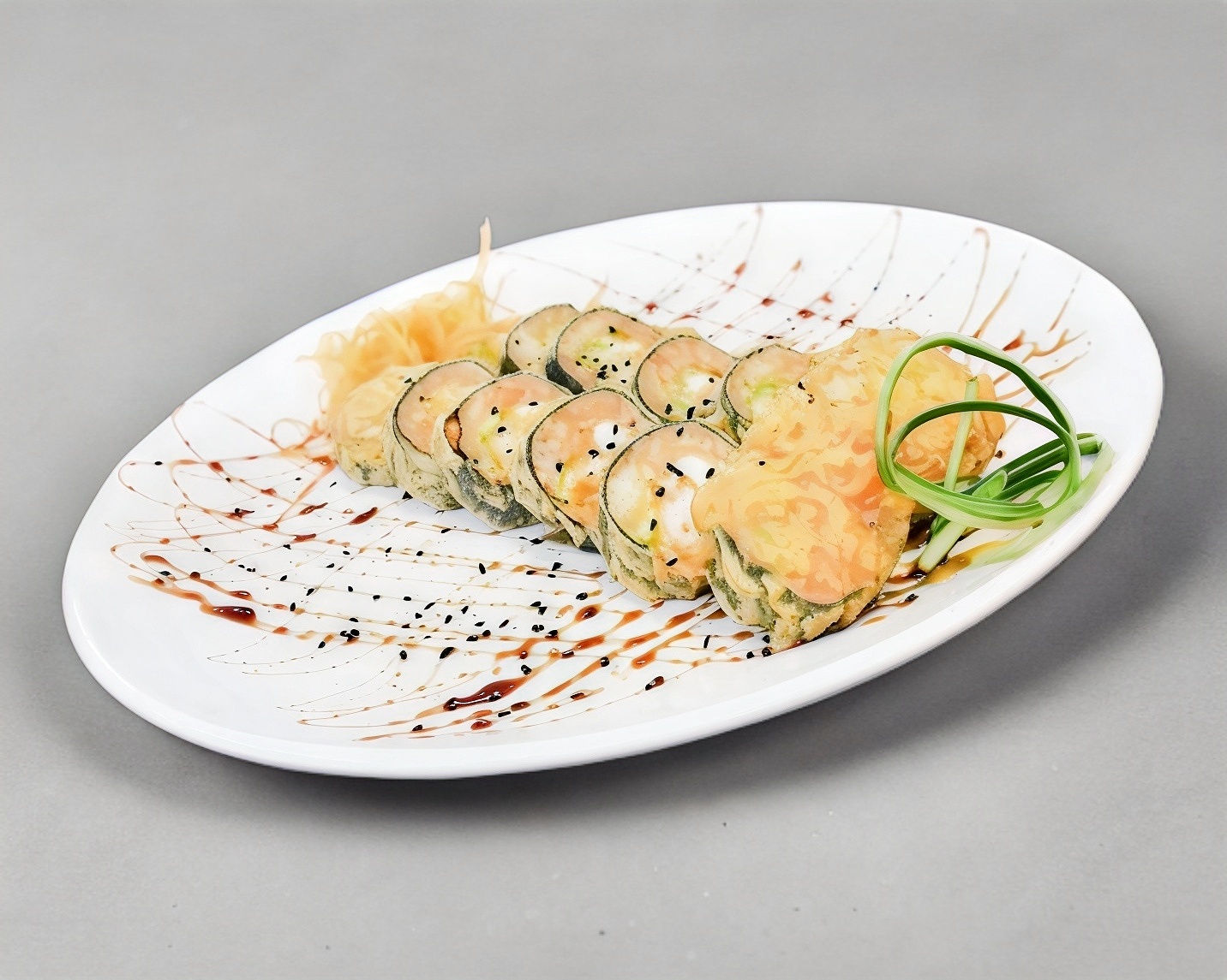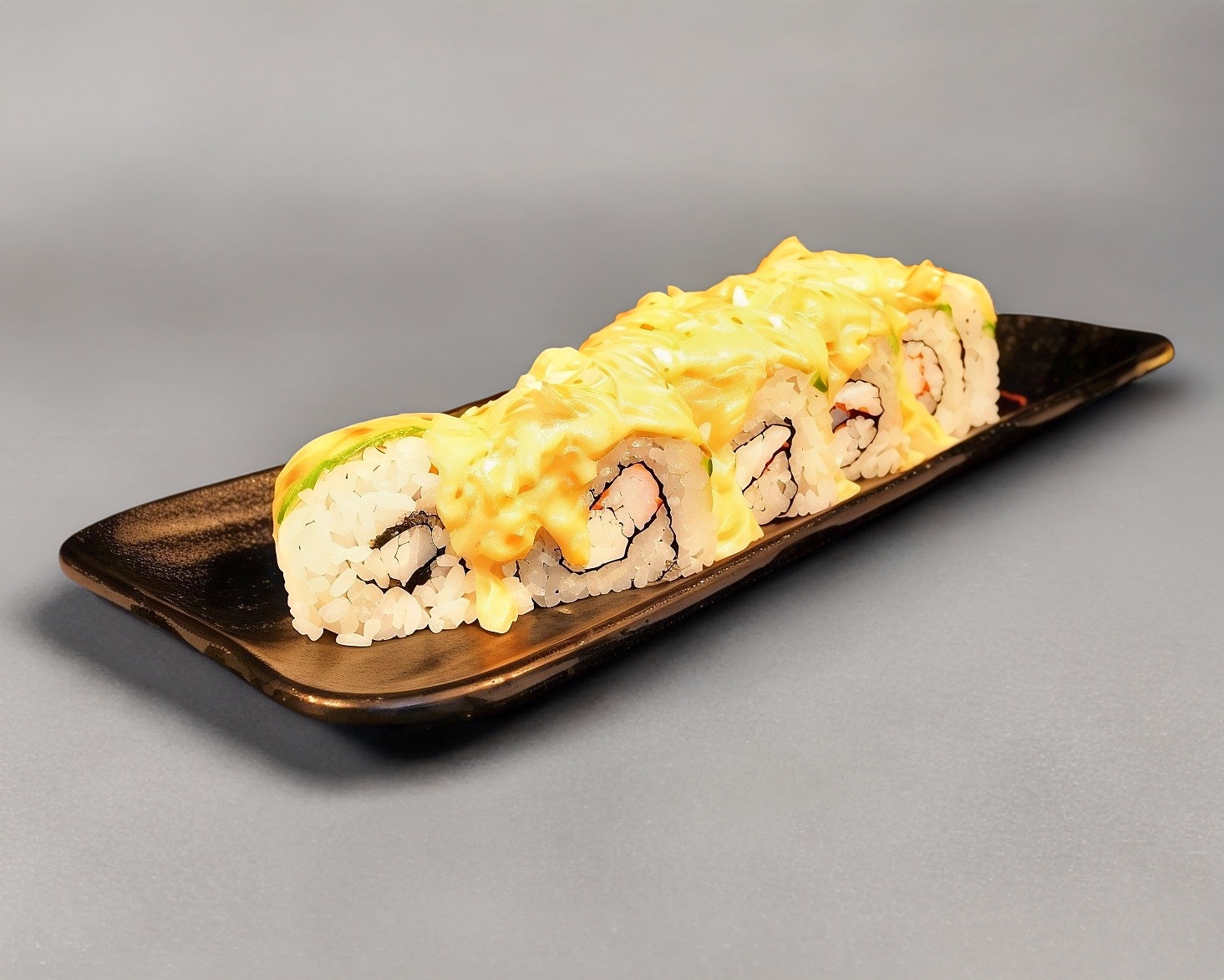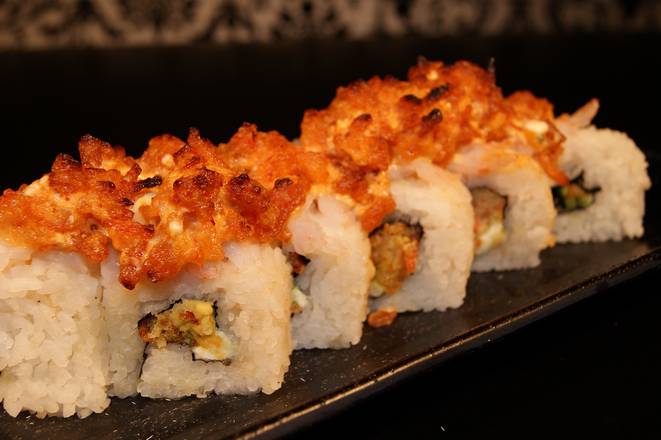 Sushi de 10 piezas, queso crema, aguacate ,camarón y carne de res, empanizado con salsa de anguila y ajonjolí.