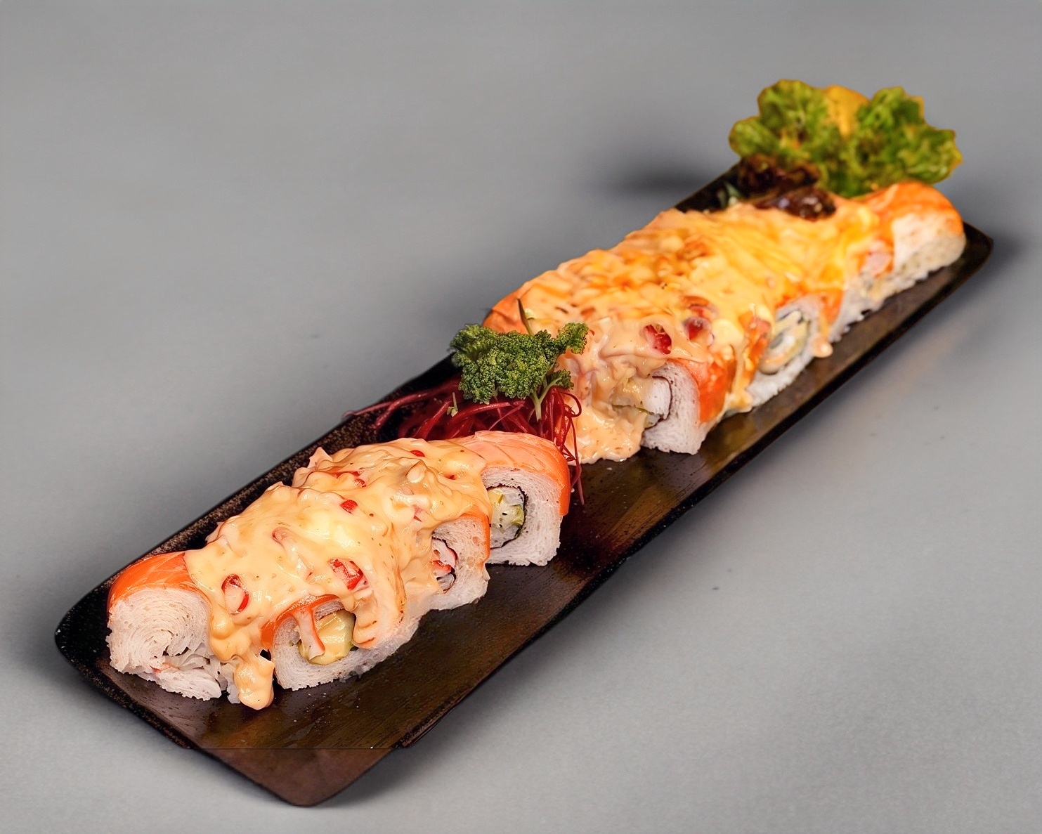 Salmon gratinado, queso manchego, pulpo, camarón, surimi, aguacate por dentro.