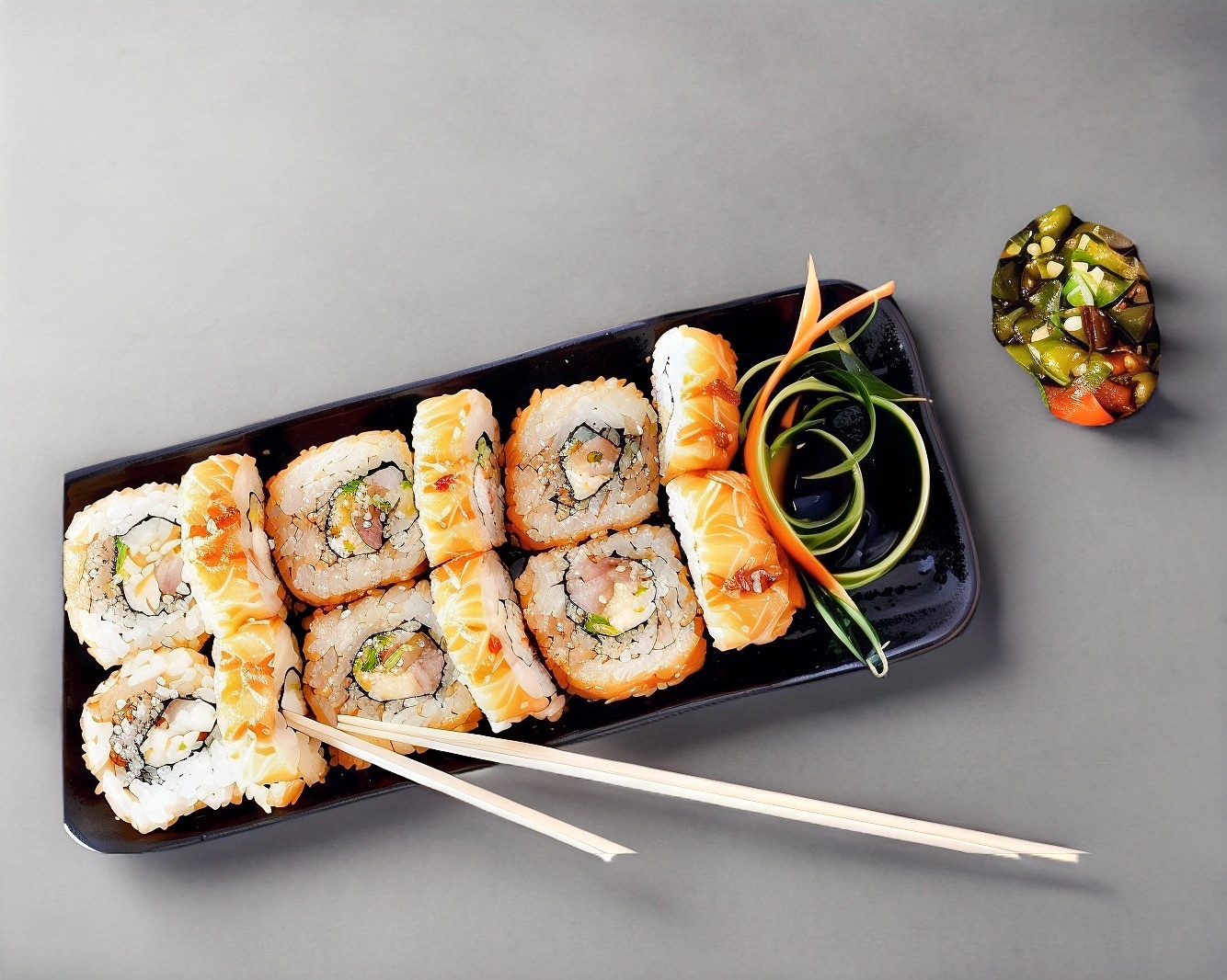 Queso, pepino, salmón por dentro, ajonjolí por fuera.