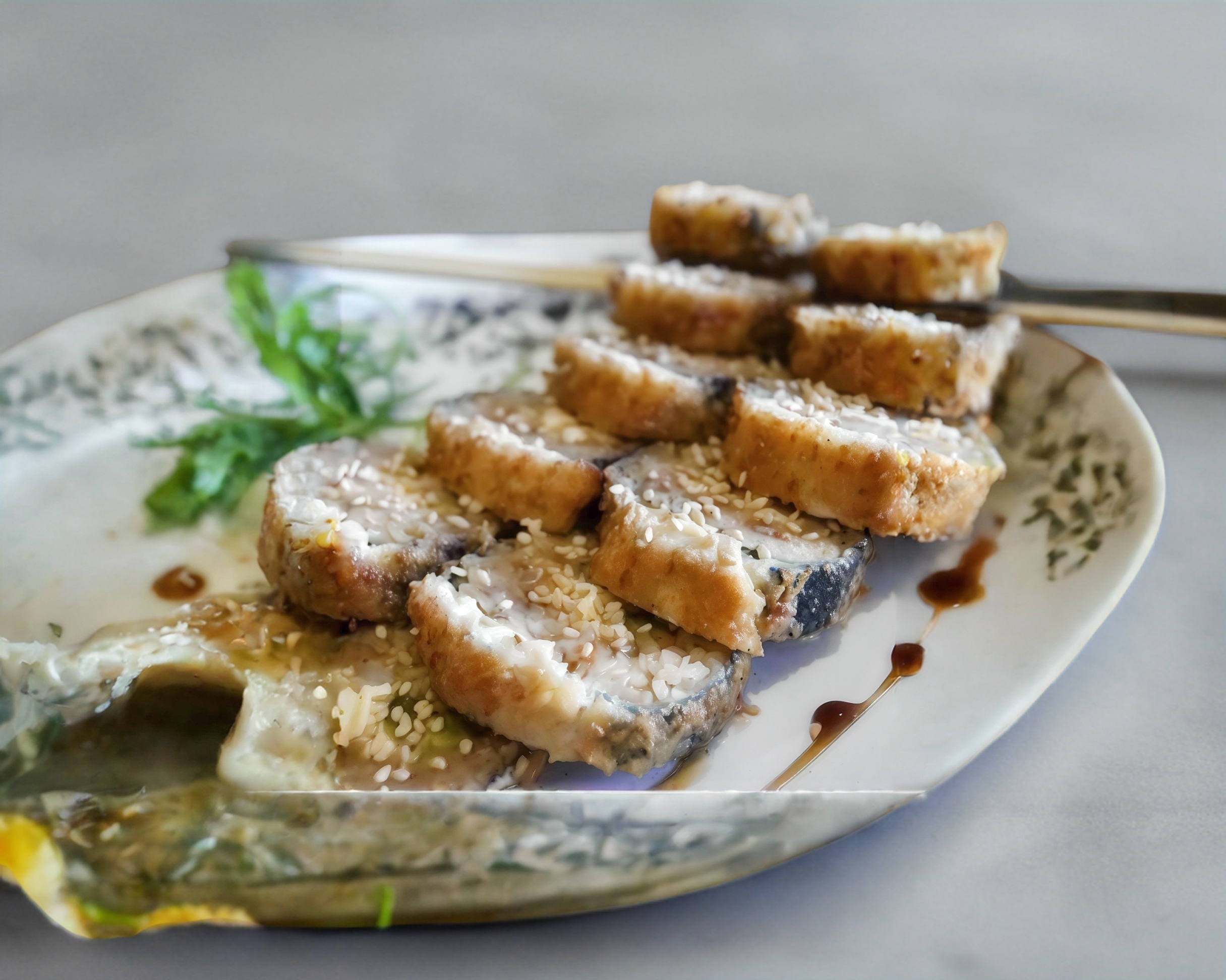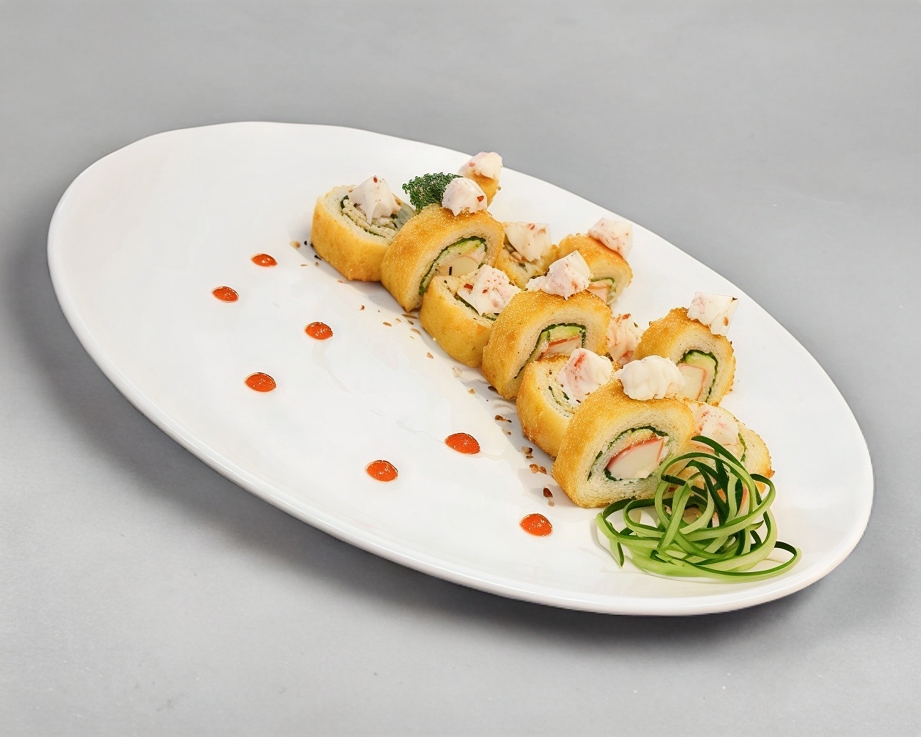 Queso crema, aguacate, pepino y camarón, empanizado con salsa de anguila y ajonjolí.
