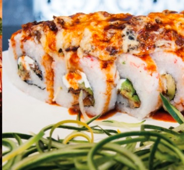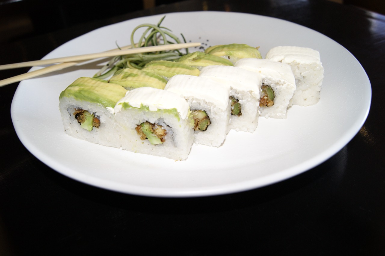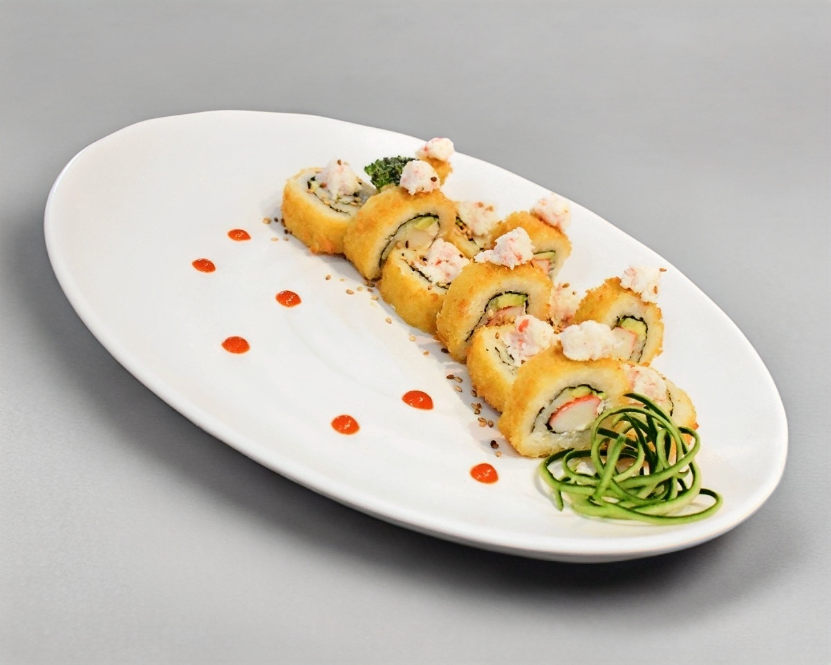 Arroz frito, queso crema, aguacate, camarón tempurada capeadoArroz frito, tampico, aguacate, camarón, empanizado, salsa de anguila por fuera.