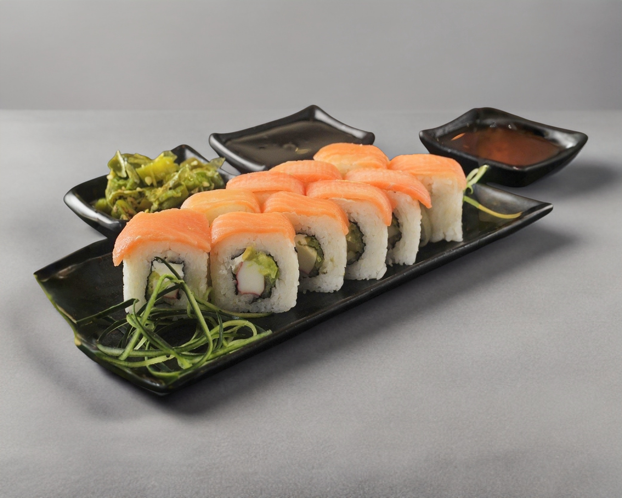 Salmon por fuera, queso crema, aguacate, pepino cangrejo por dentro.