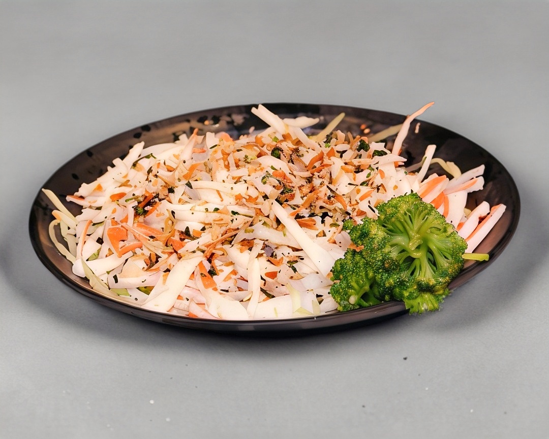 Ensalada de pepino con salmón, pulpo, camarón, surimi, ikura y furikake con su aderezo japonés.