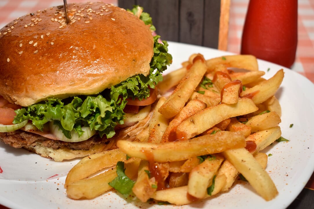 Hamburguesa con queso amarillo, queso blanco, 1 carne de res, salchicha, jamón, cátsup, mostaza, cebolla, jitomate, lechuga y chile.