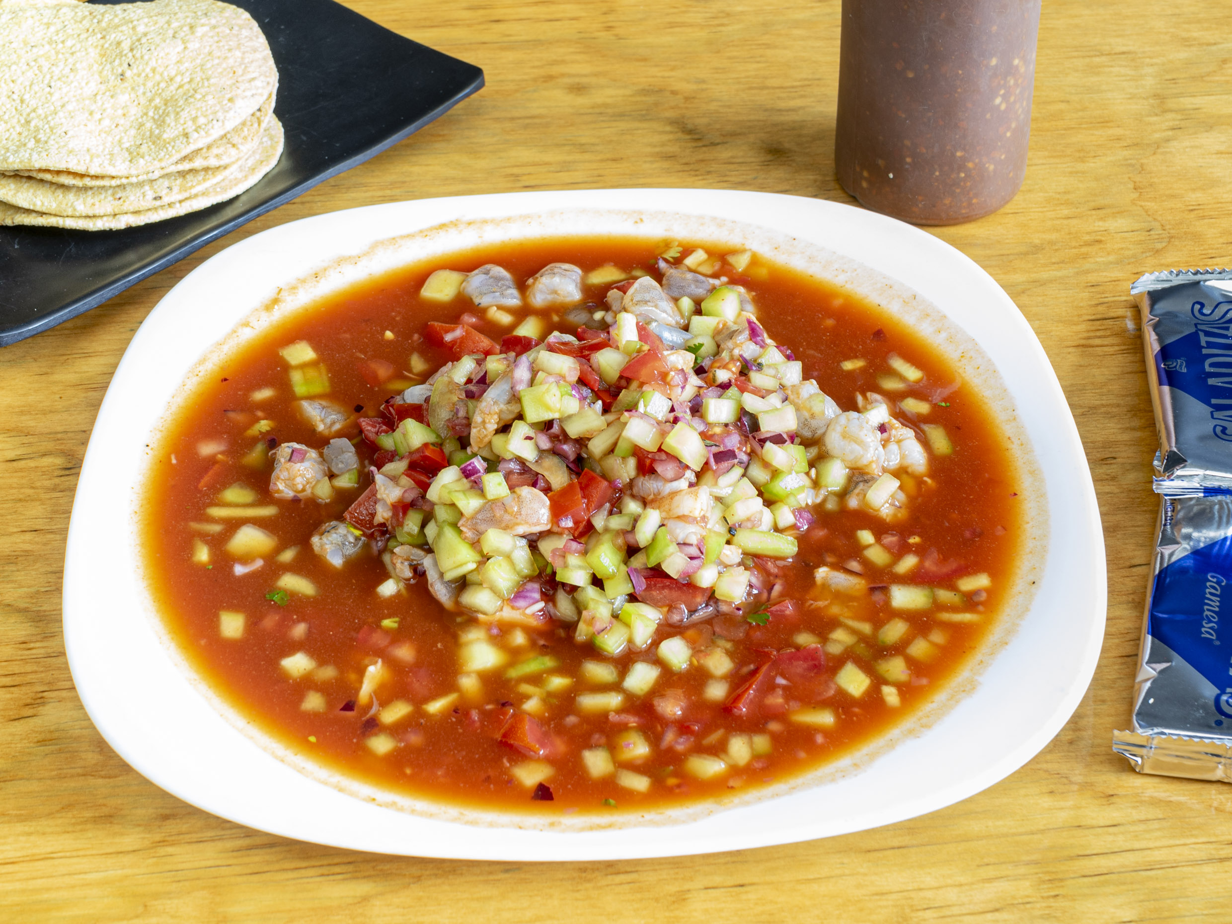 Camarón curtido en jugo de limón, pepino, tomate, cebolla, con un toque de salsa de la casa.