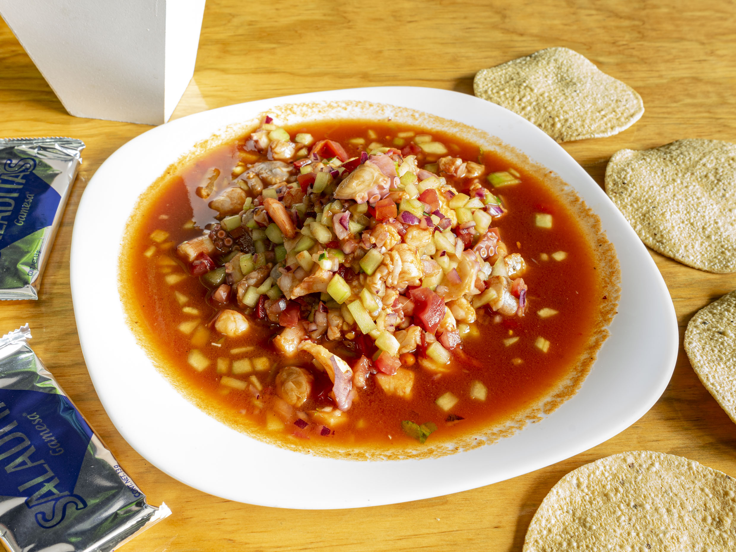 Camarón crudo, camarón cocido, pulpo, pepino, tomate, cebolla, cilantro, jugo de limón, acompañado de salsa de la casa.
