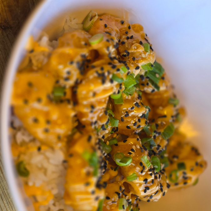Base de arroz blanco y camarones capeados estilo "Roca" con nuestro aderezo dulce y un toque picoso.2