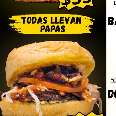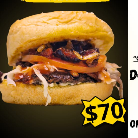 Jugosa carne molida 100% res, mermelada de tocino, repollo, tomate, queso y aderezo de la casa. Comer grasoso es comer sabroso.