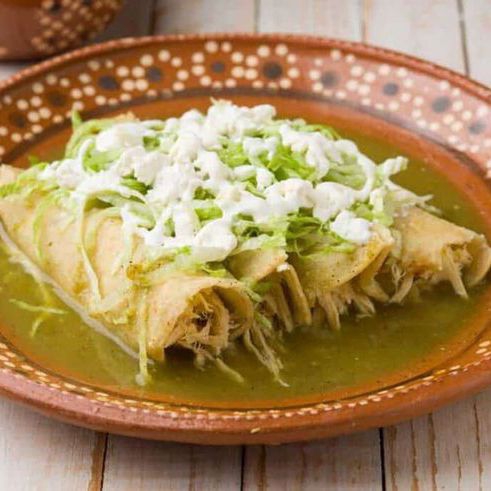 4 Ricas enchiladas acompañadas de lechuga, jitomate, cebolla, crema, salsa chilena o roja.