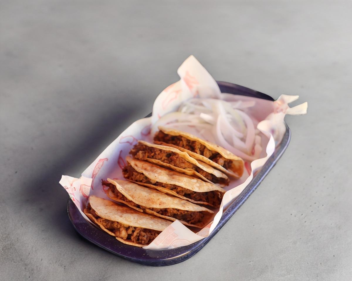 5 Tacos de tortilla de maíz de carne maciza de barbacoa, acompañados de cebolla en julianas y salsa de la casa.
