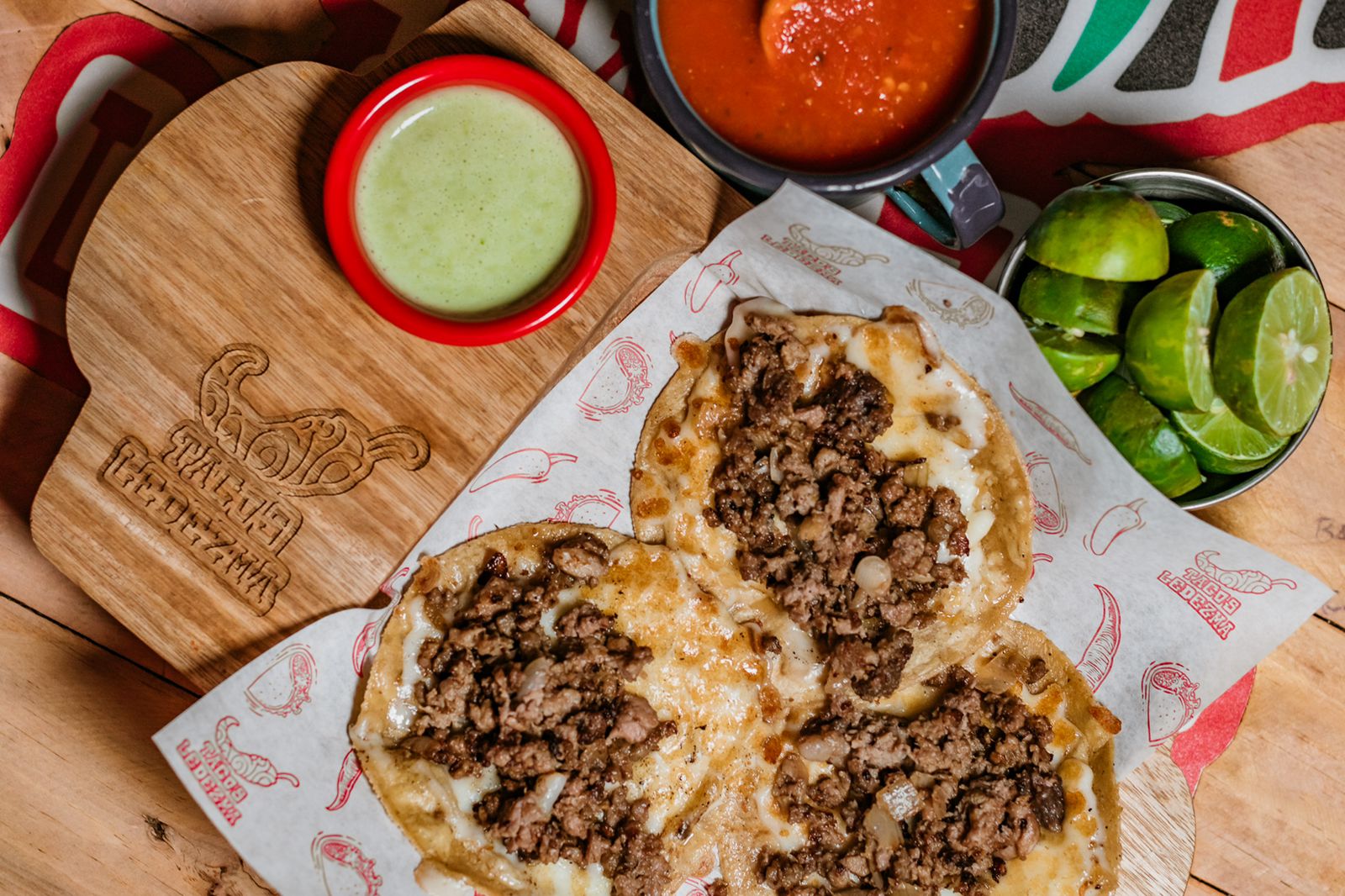 160 Gramos de bisteck encebollado con una tortilla de queso gratinado acompañado de salsa chilena y 5 tortillas de maíz.