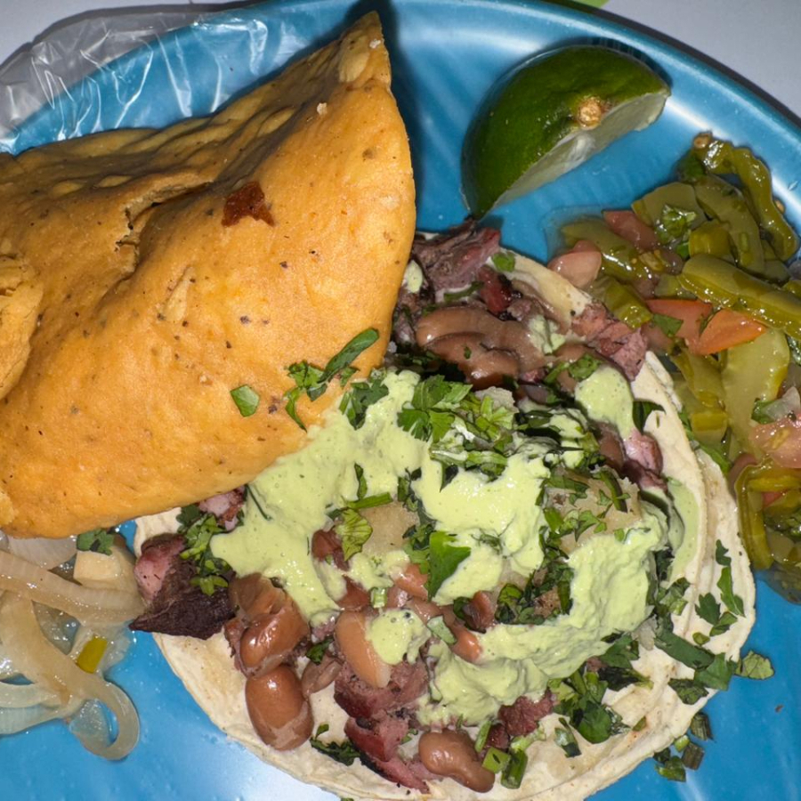 tortilla doble, bistec, verdura, cebolla asada