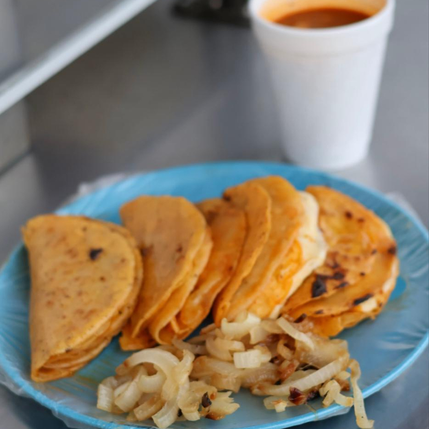 quesadilla en tortilla de harina, chorizo ,papa, frijol, tostada