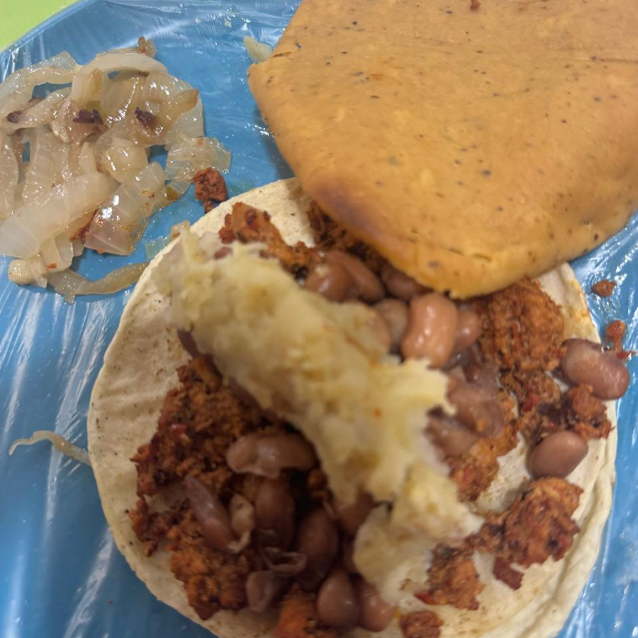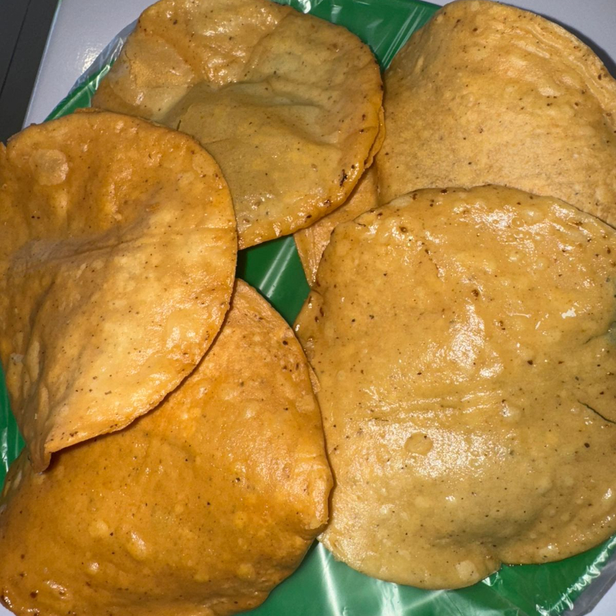 tortilla grande doble, chorizo, papa, frijolito y tostada