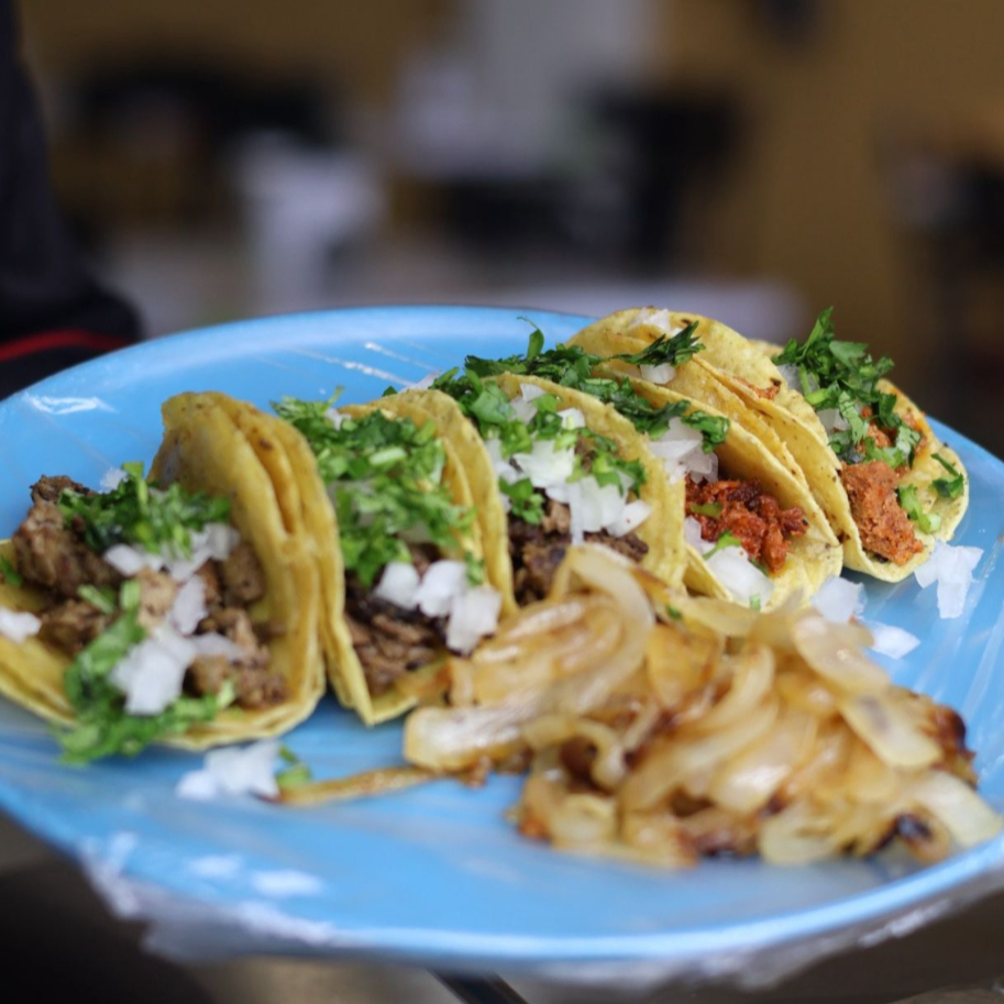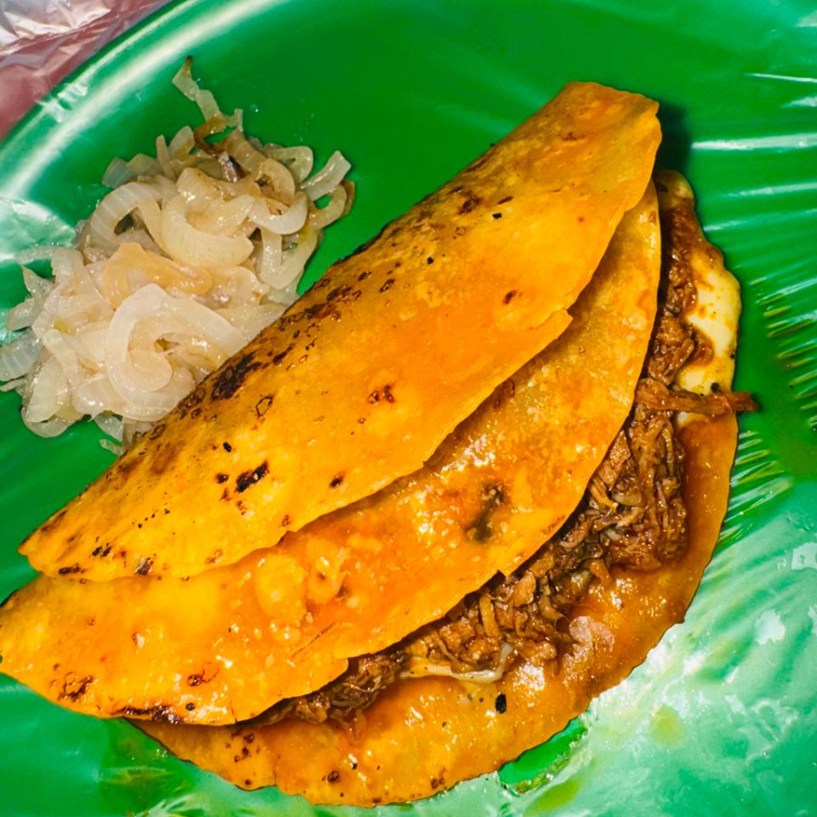 Tortilla doble dorada, barbacoa, cebolla asada, incluye consomé