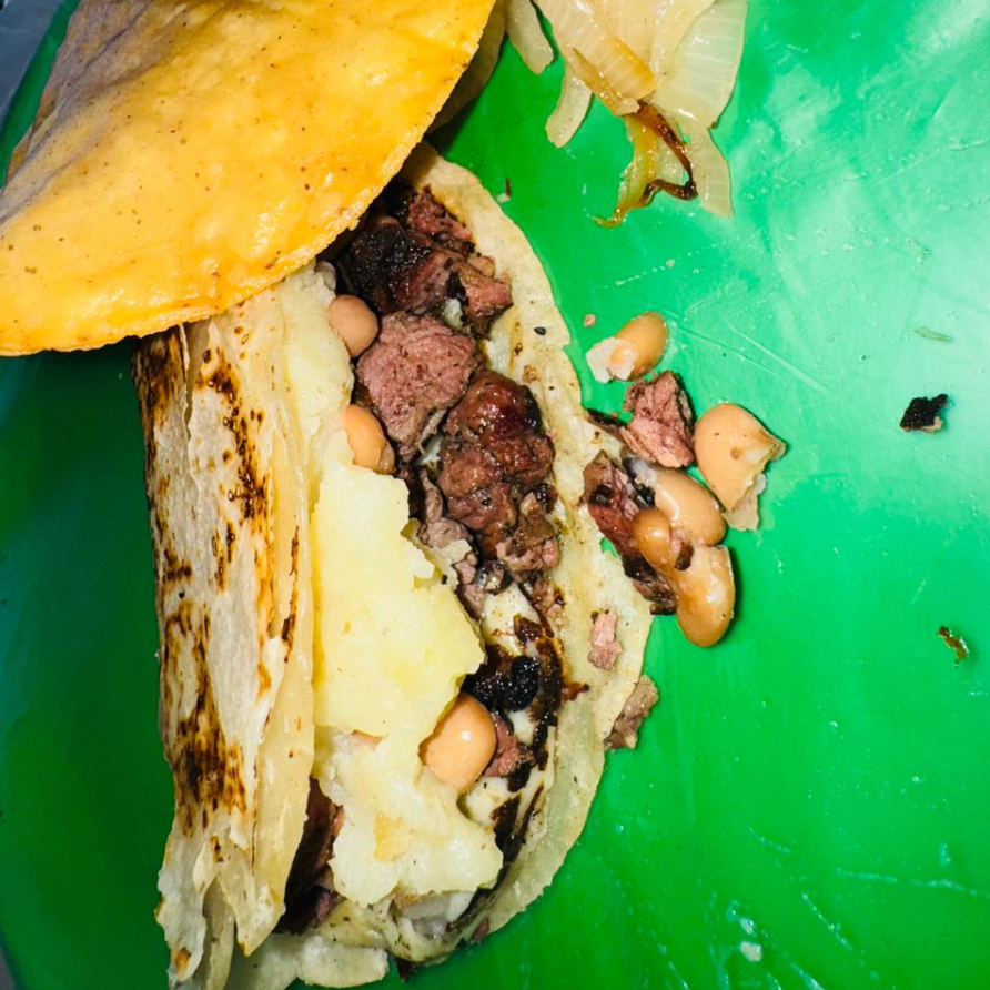 tortilla grande doble, arrachera, papa, frijolito y Tostada