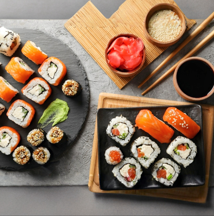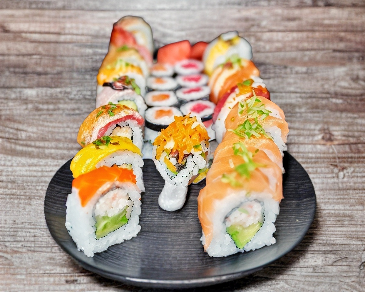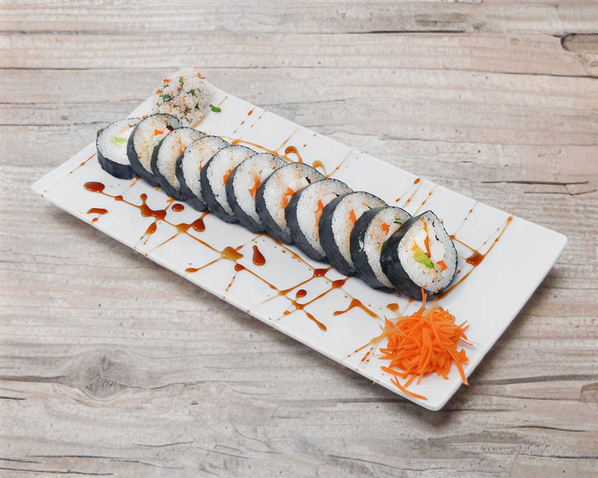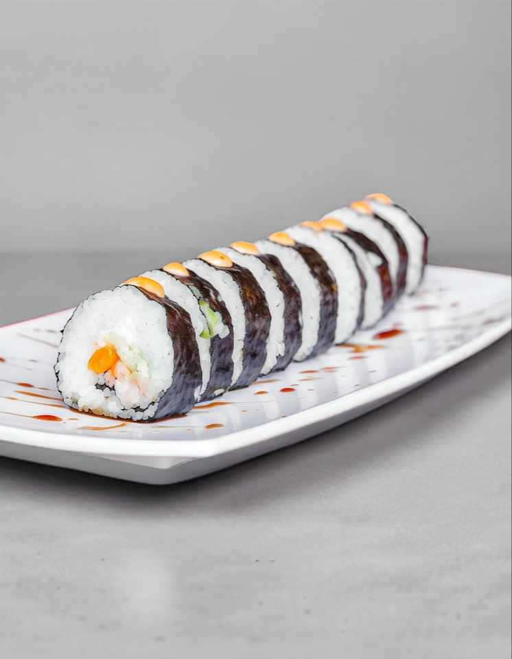 Suculenta mezcla de surimi y camaron, queso crema, pepino, zanahoria y aguacate en un rollo california, dentro de otro rollo california, dentro de otro rollo, alga nori en el exterior 250grs