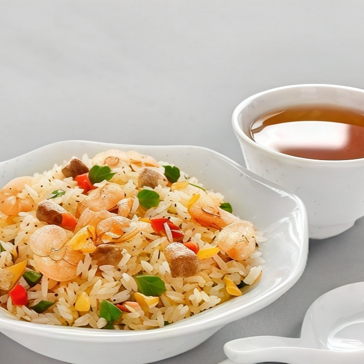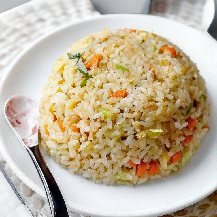 Delicioso arroz a la plancha acompañada de trocitos de zanahoria, calabacita, pimiento,huevo, queso crema, tampico
