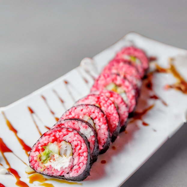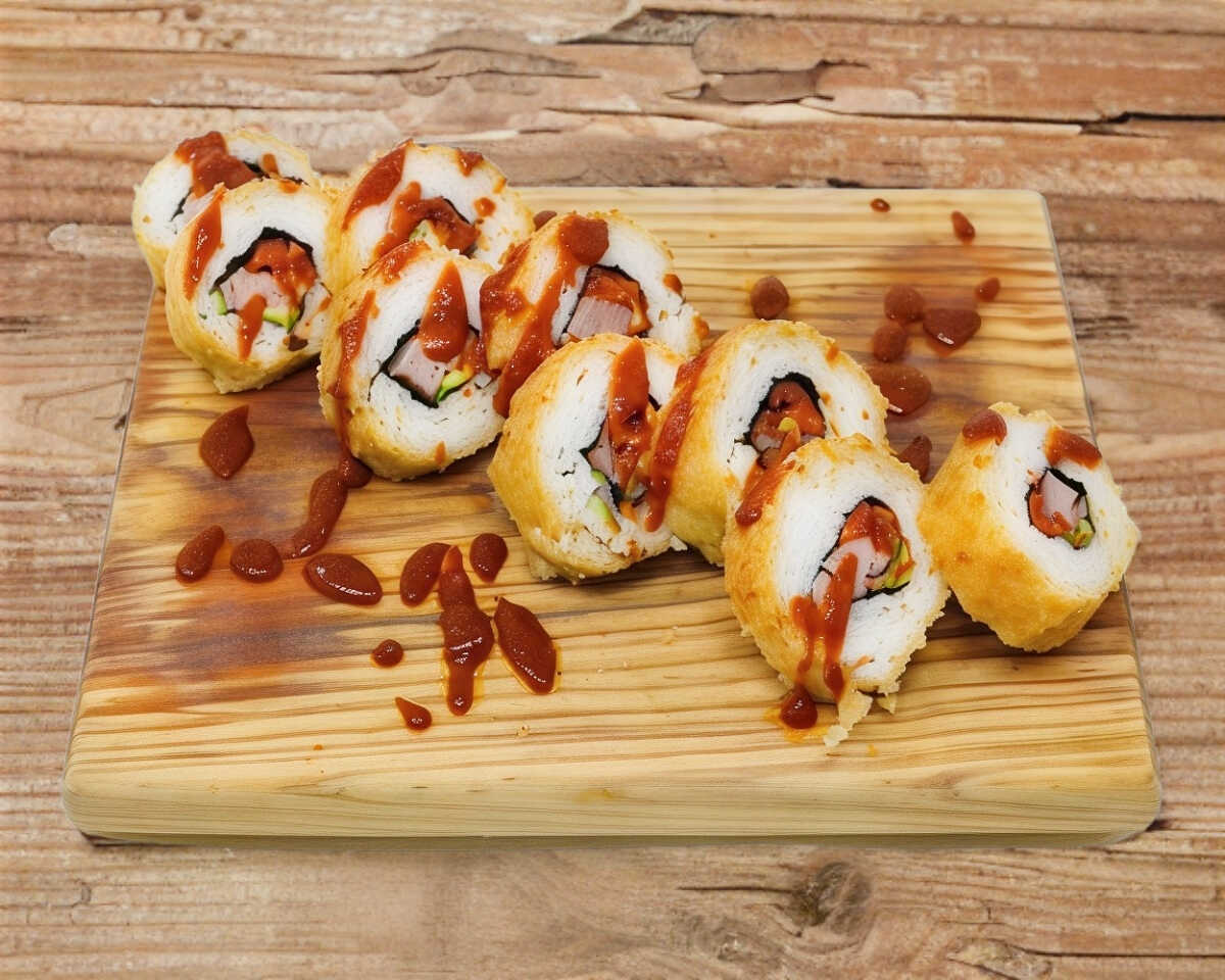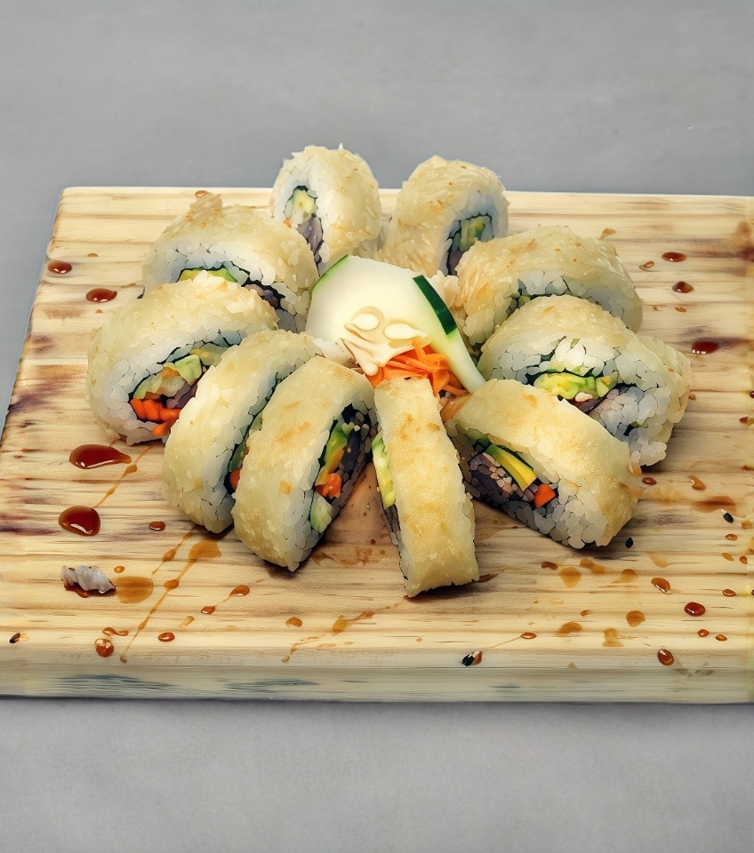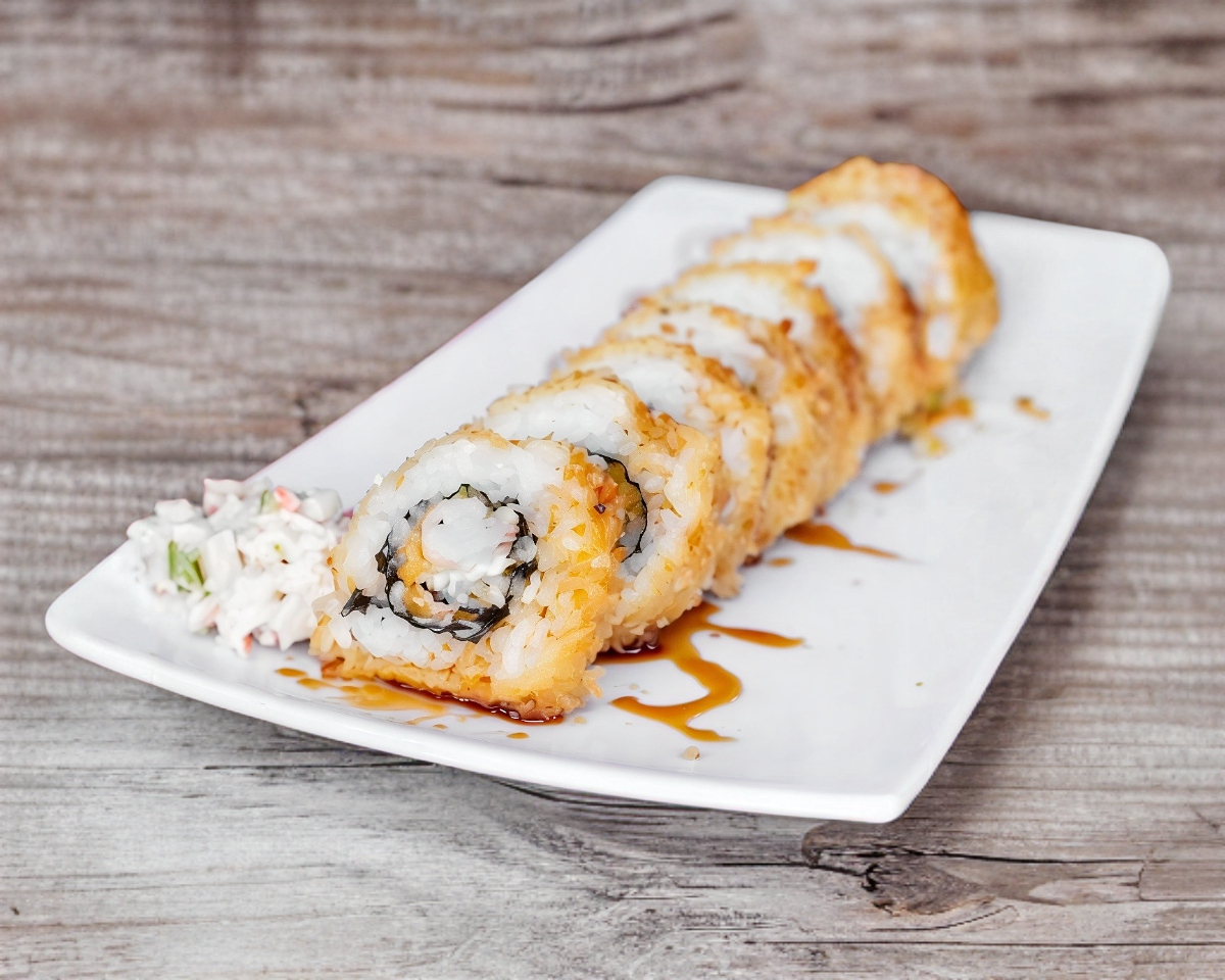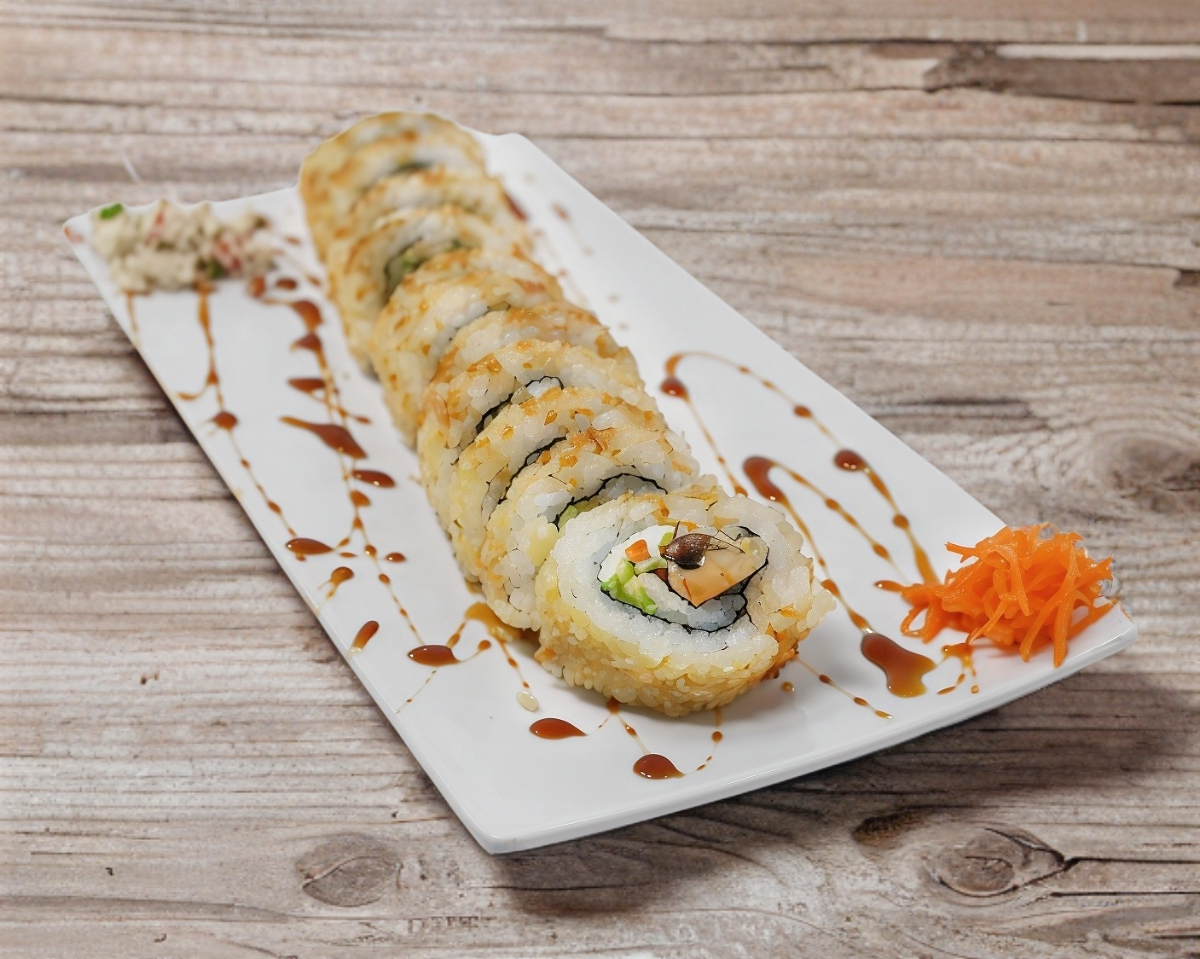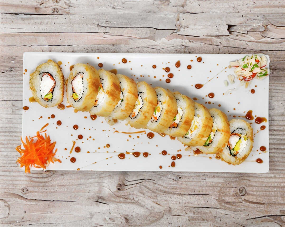 Mezcla de surimi empanizado, queso crema, zanahoria, aguacate y pepino, en el exterior empanizado, presentado con salsa anguila