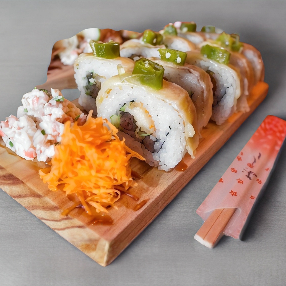 Deliciosa Combinacion de carne arrachera, pepino y aguacate, en el exterior cubierto con queso cremao ranch