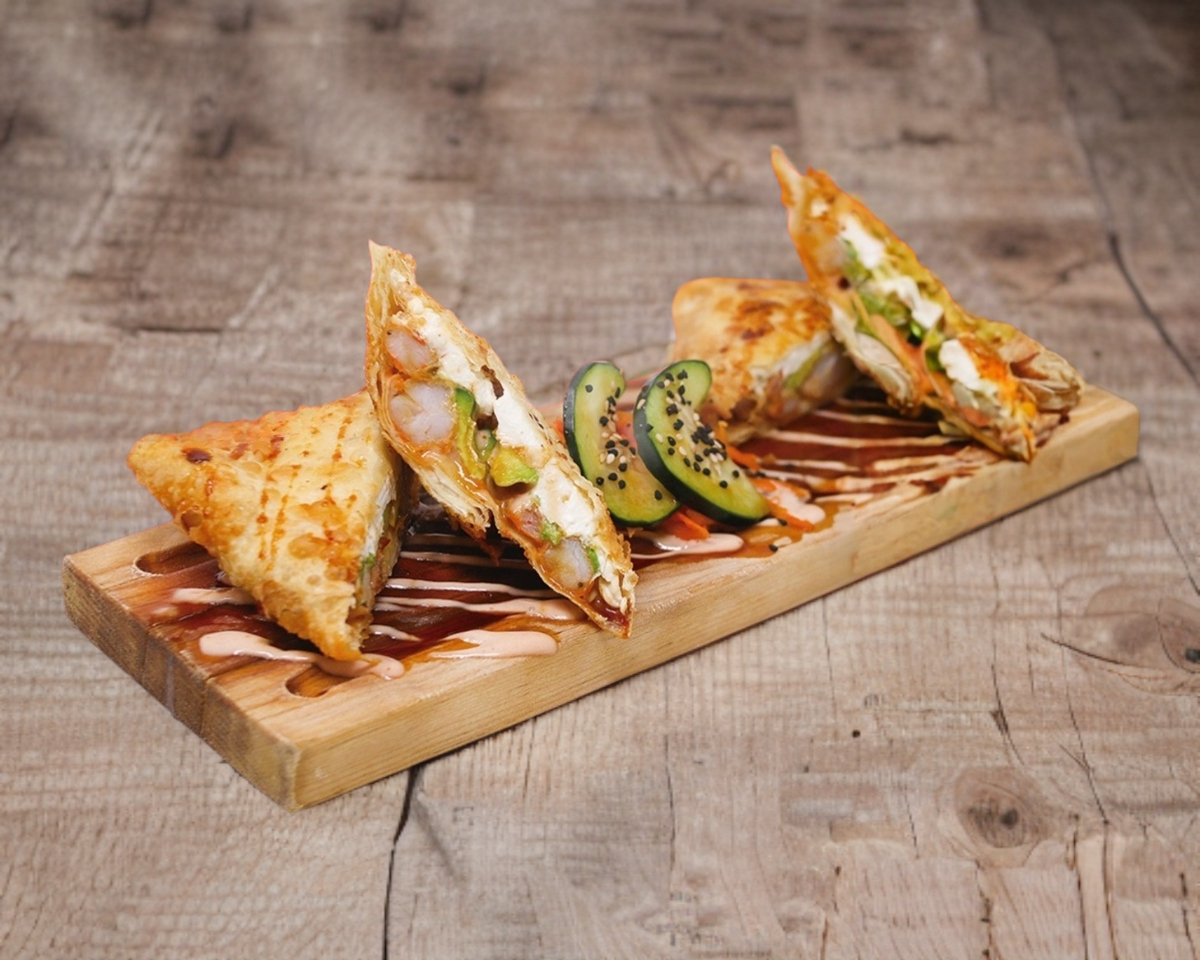 Explosiva combinacion de arrachera, pollo y camarón, queso crema, aguacate y zanahoria, en el exterior empanizado con guacamole, chorizo a la plancha y salsa picosita
