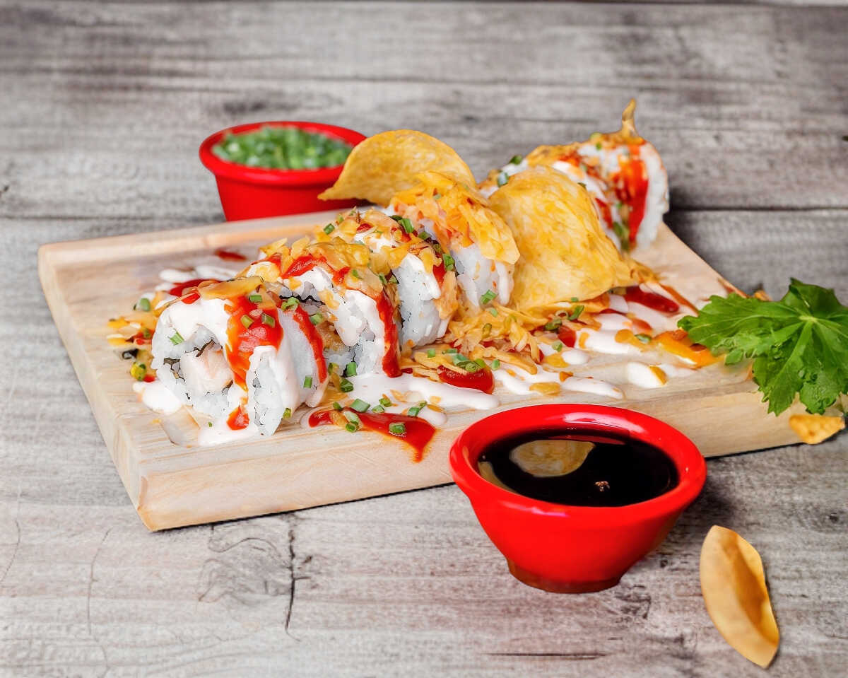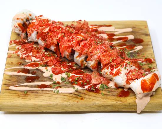 Extravagante mezcla en el interior de salmon fresco, atun fresco, pepino y chips jalapeños, en el exterior topping de chips fuego, salsa fuego, salsa siracha y cebollin 250grs