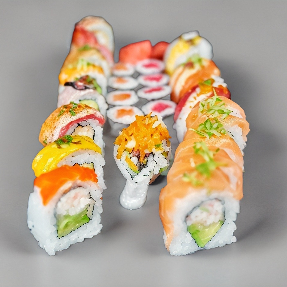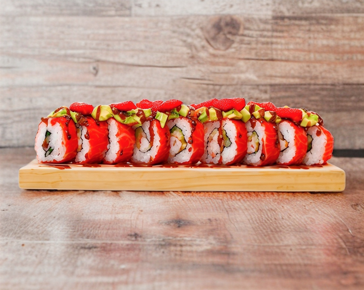 Extravagante mezcla en el interior de salmón fresco, atún fresco, pepino y chip jalapeño, en el exterior topping de chip jalapeño, aderezo aurora, salsa siracha y cebollín 250grs. (1 rollo de 9 pzs apróx.)