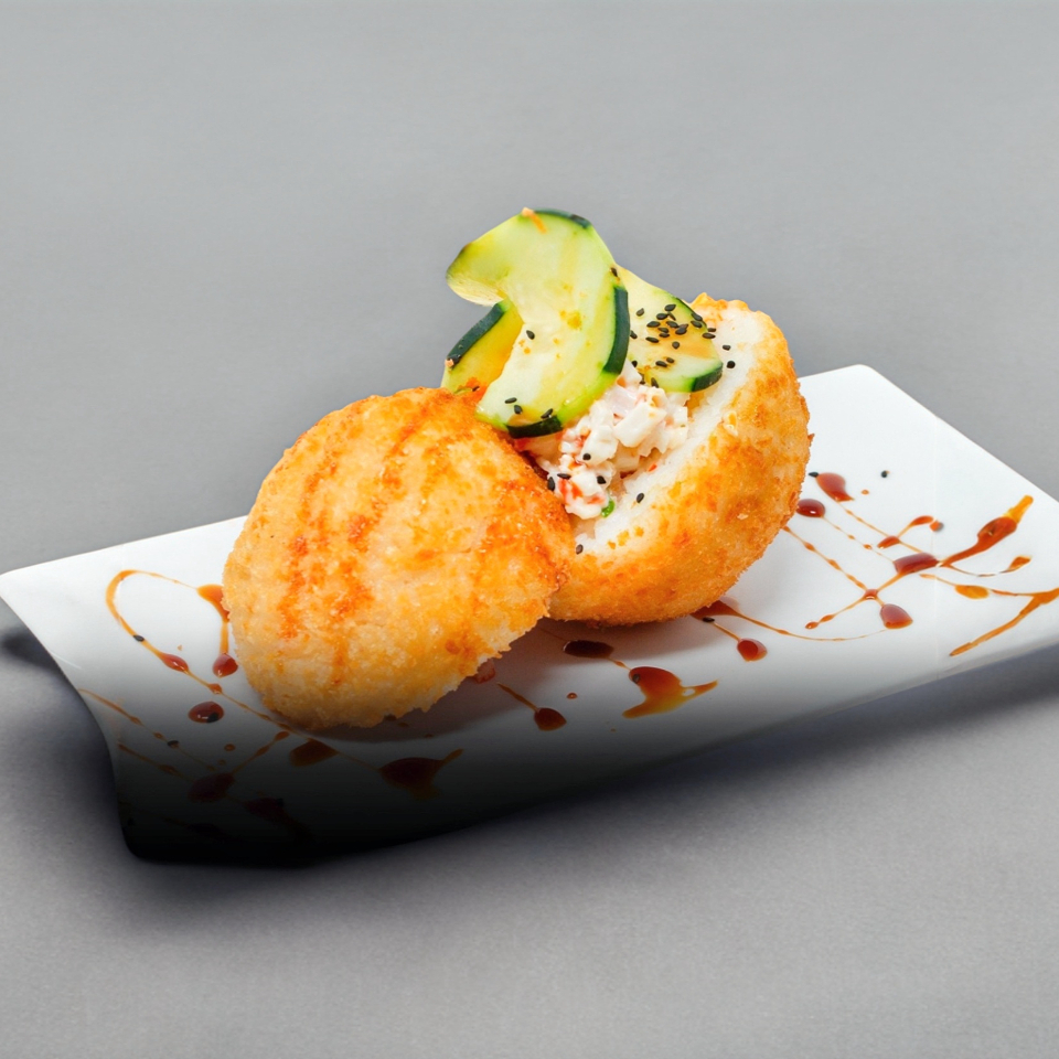 Bola de arroz con relleno de surimi 300grs, el exterior puede ser natural, con ajonjoli negro o blanco, capaeada o empanizada