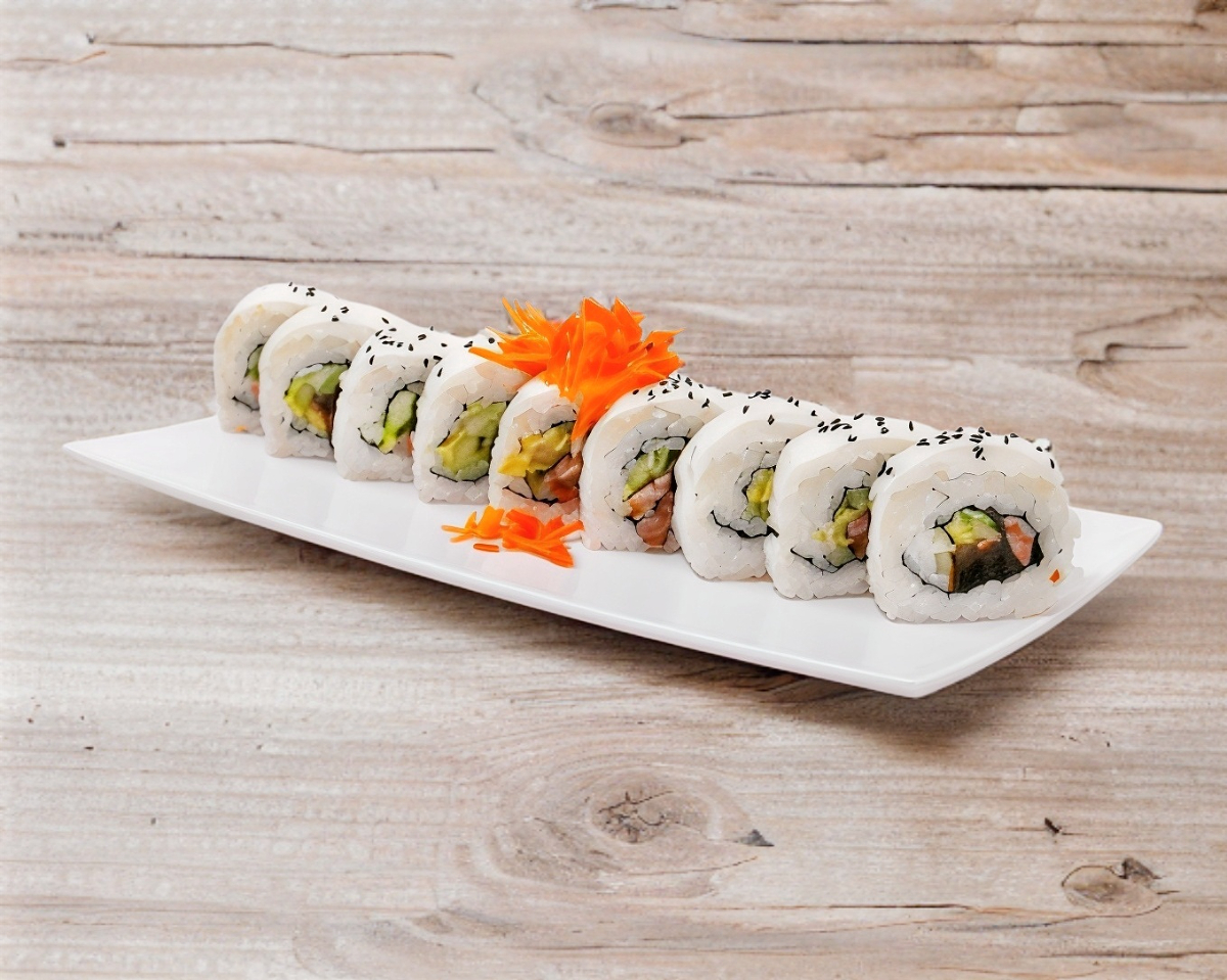 Apetecible mezcla de salmón fresco, aguacate, queso crema, zanahoria, pepino, en el exterior decorado con ajonjolí negra (1 rollo de 9 pzs apróx.)