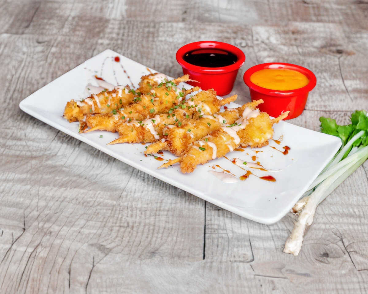 Exquisitas banderillas de camaron empanizado con panko y 1 trocito de queso chichuahua, presentados con un toque de salsa aguila, aderezoo aurora y cebollin