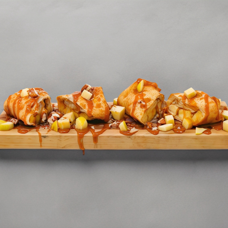 Mini burritos, fritos de egg roll, rellenos de cajeta, nuez y manzana, espolvoreados con azucar y canela