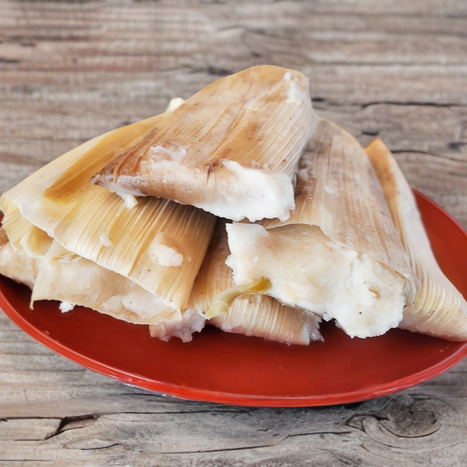 Tamal envuelto en hoja de maíz, relleno de chile guajillo, con carne de puerco.