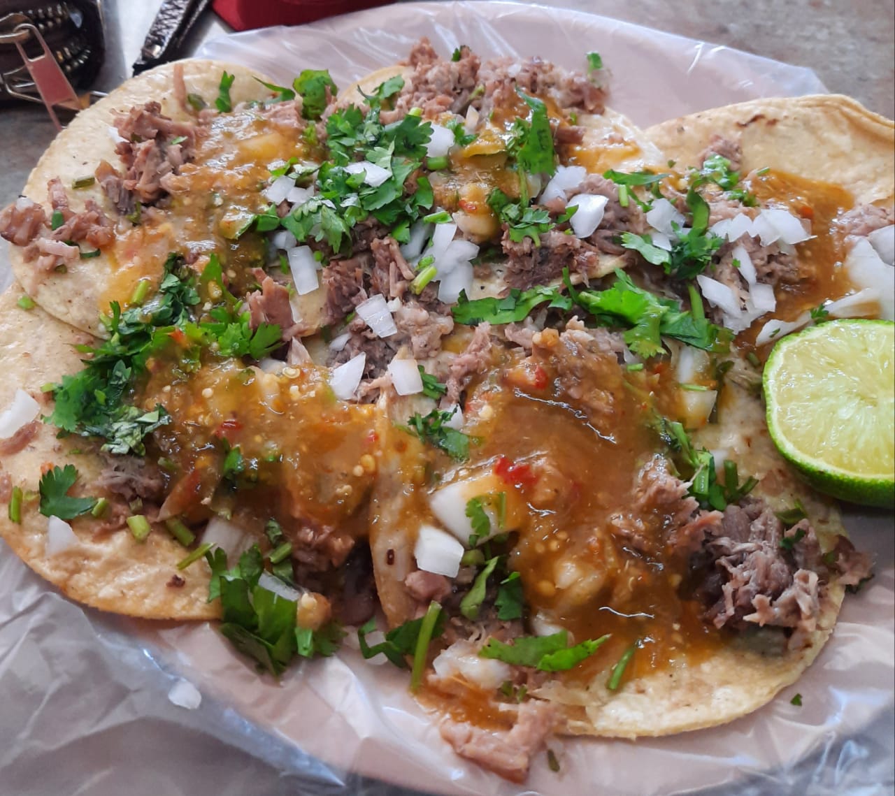 Orden de 5 tacos con tortilla de maíz, cabeza y complementos aparte (salsas, limones, cebolla y cilantro) (Porción personal)