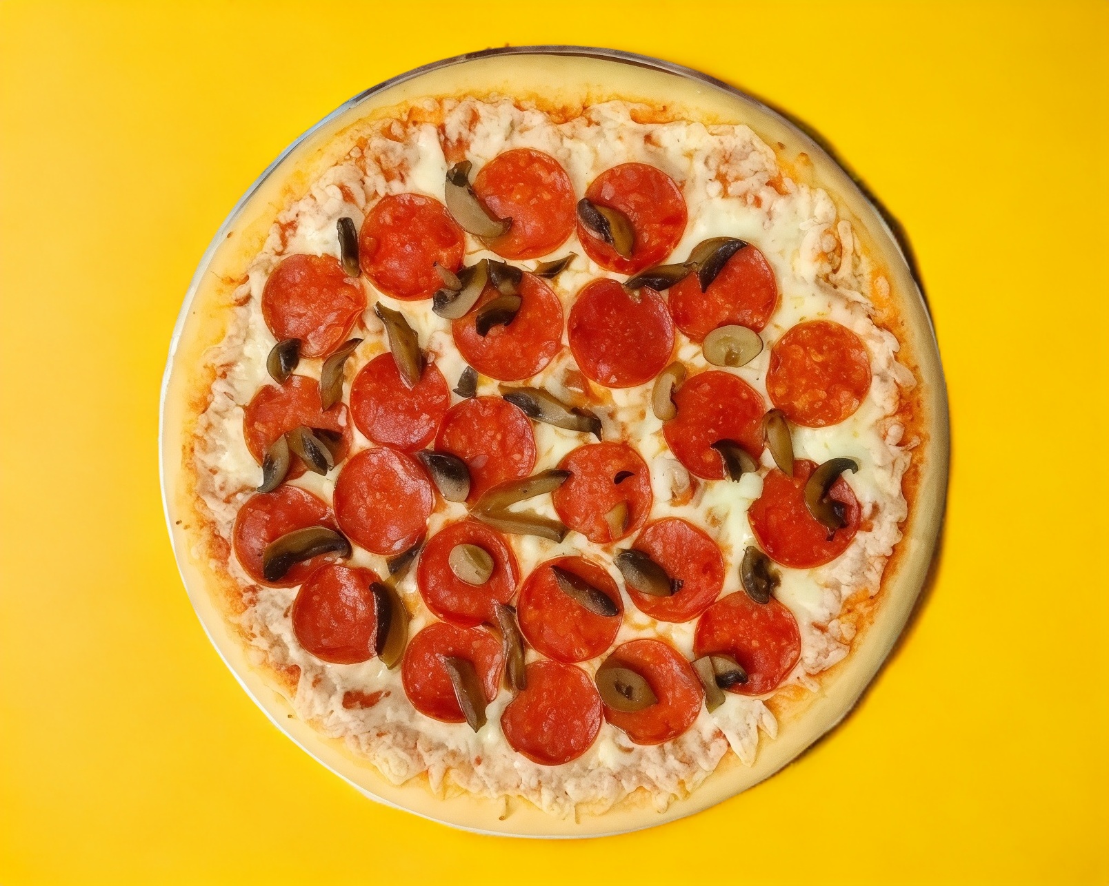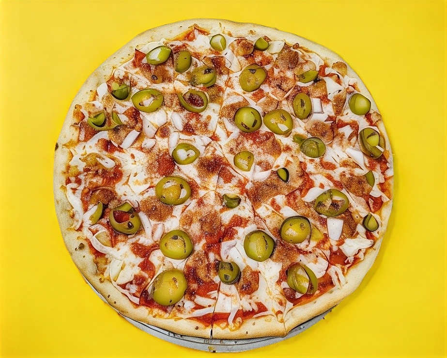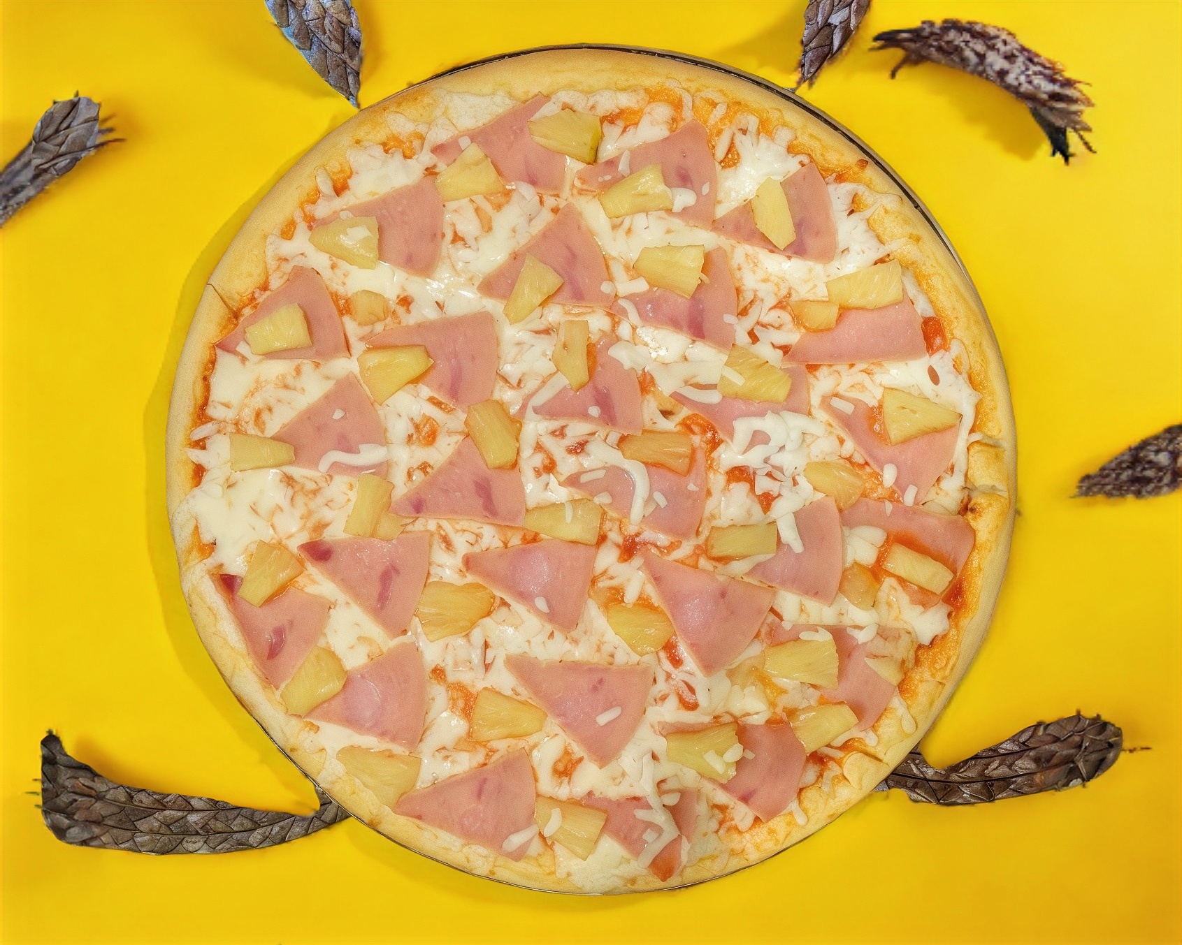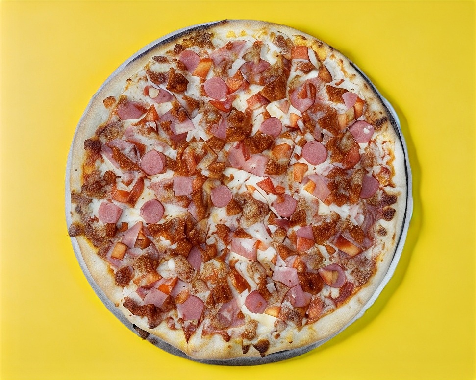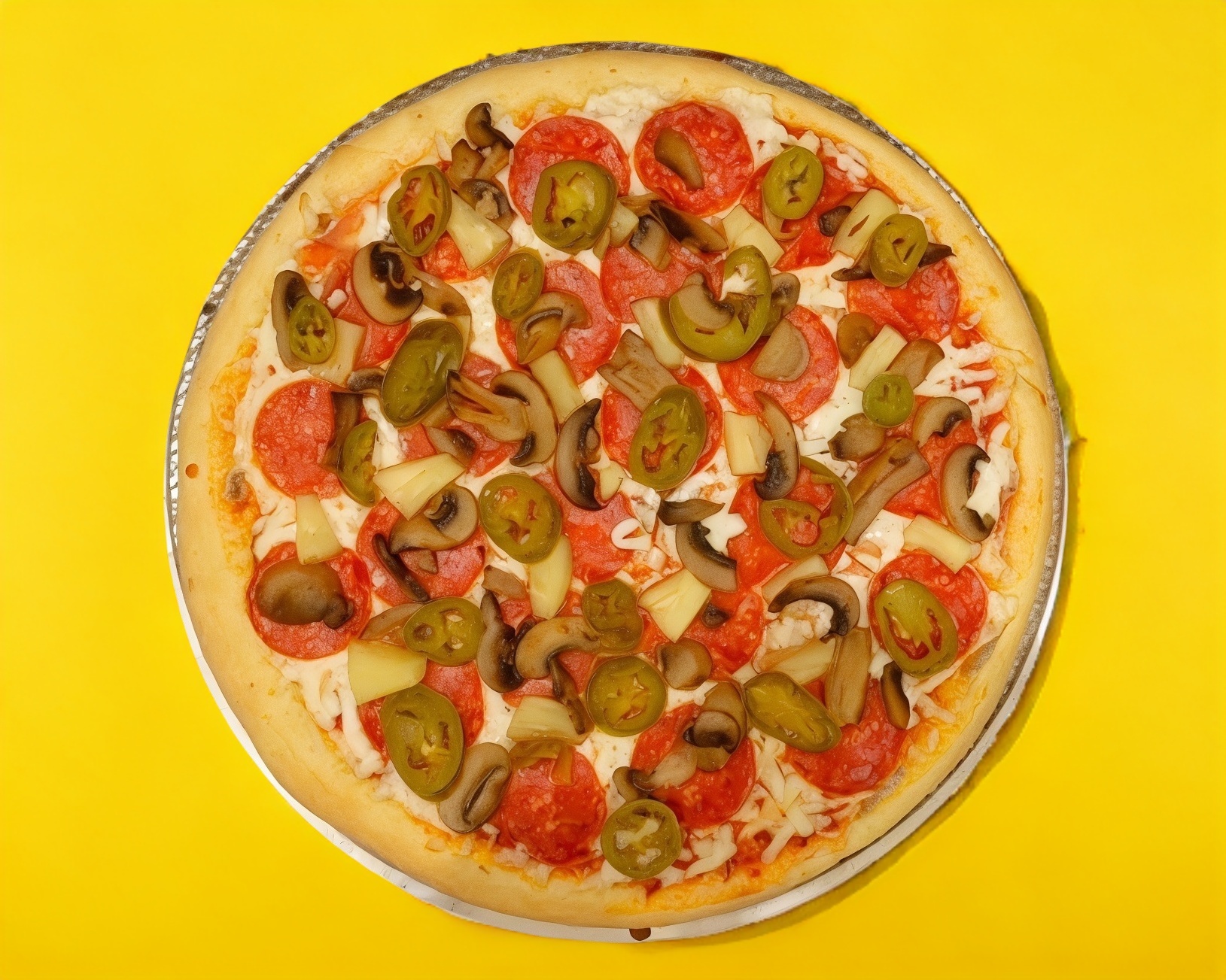 Jamón, salchicha, chorizo, tocino, cebolla, pimiento, jitomate.