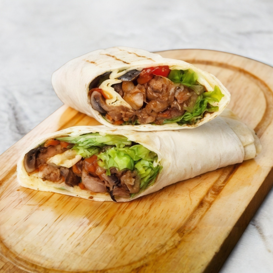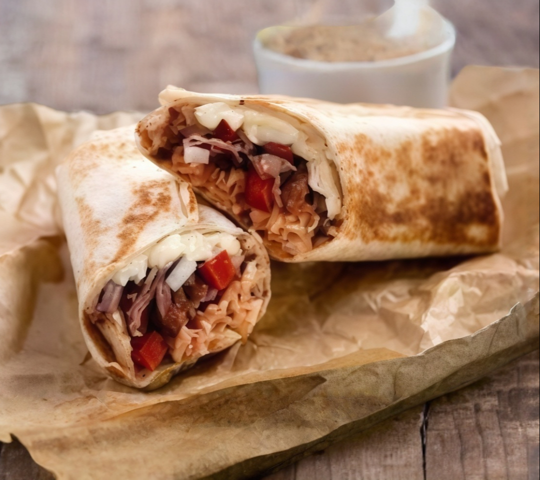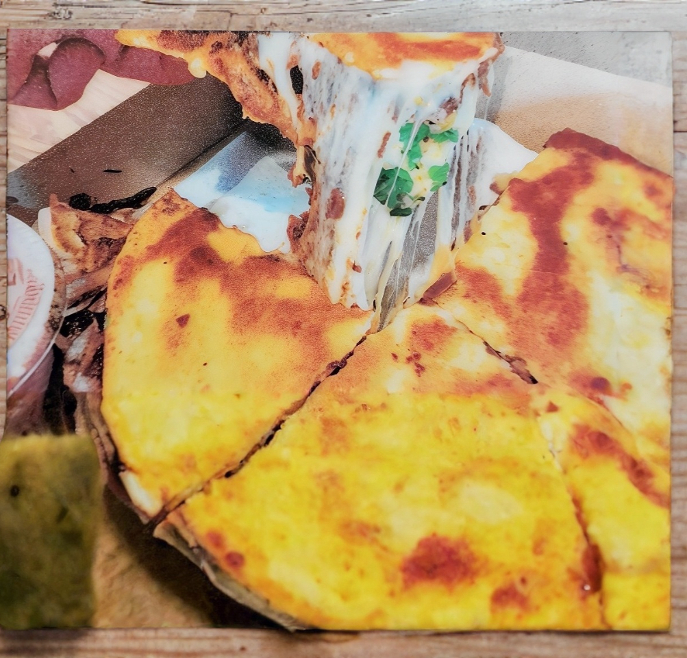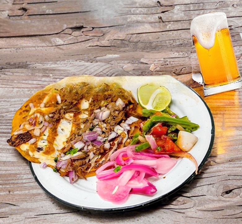 Con tortilla de harina 23 cm., acompañada de frijoles de la olla, rábanos y salsa de aguacate.