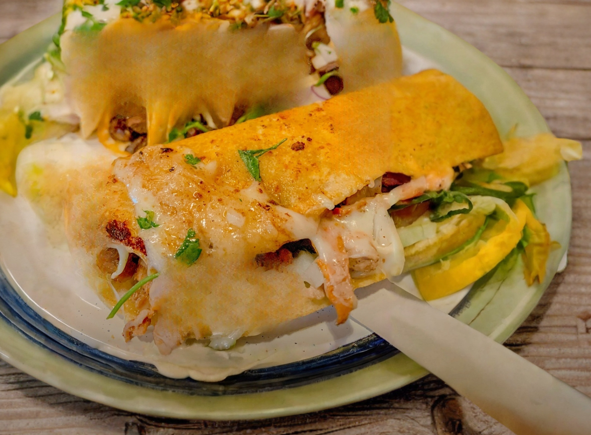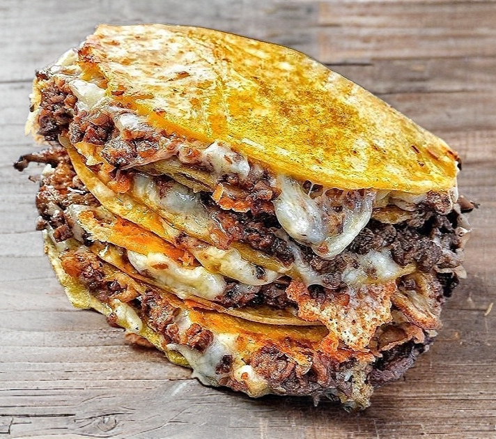 Tortilla de maíz de 15 cm. con queso bañada en consomé de birria.