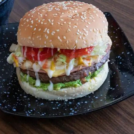 Una deliciosa hamburguesa con carne 100% de res de 150g, acompañada de una generosa capa de aguacate fresco, jamón, queso amarillo y queso blanco derretidos, lechuga crujiente, jitomate, chile, y el toque perfecto de aderezo y cátsup. ¡Una combinación casera y llena de sabor que no falla!