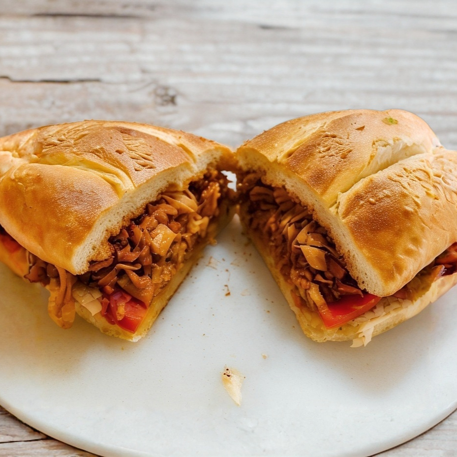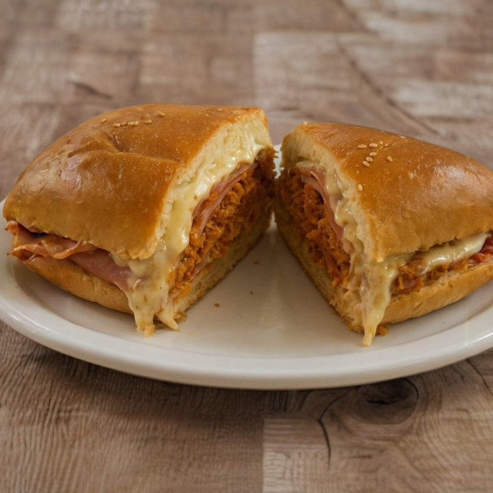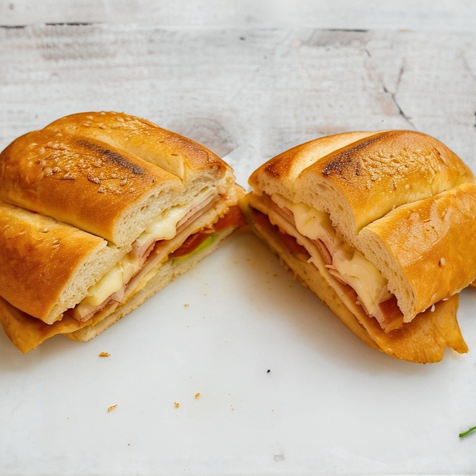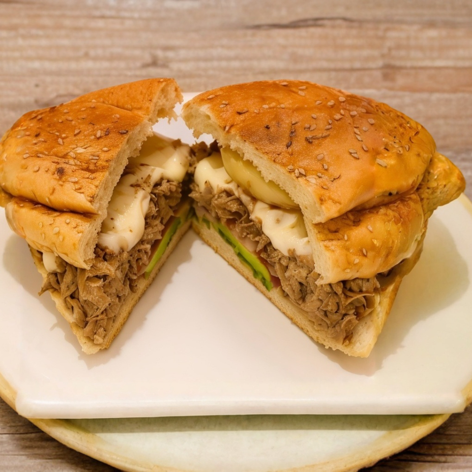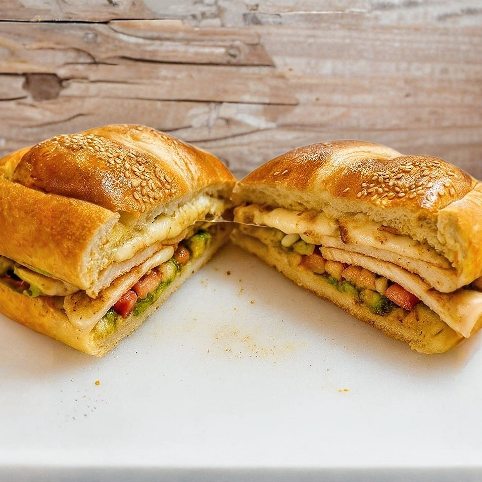 Nuestra Torta Estrella!! Lleva porciones generosas de Milanesa de res, Pierna de cerdo cocinada al vapor a las finas hierbas, Salchicha, Jamón de Pierna, Queso asadero, Aguacate, Jitomate, Cebolla, Chilitos en vinagre hechos en casa y mayonesa
