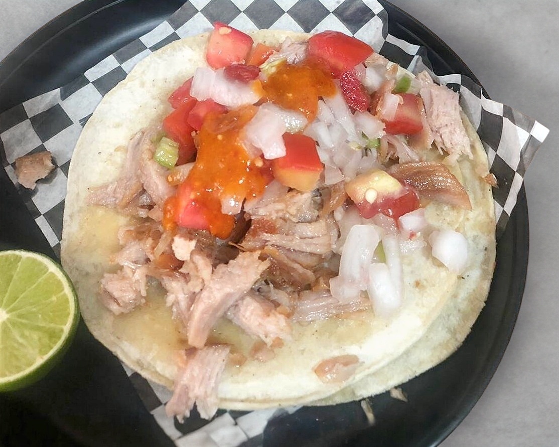 Torta de carnitas con aguacate y salsa y verdura aparte