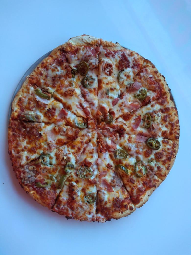 2 x 1 siempre, jamón, salami, champiñón, pimiento verde, cebolla y extra queso.